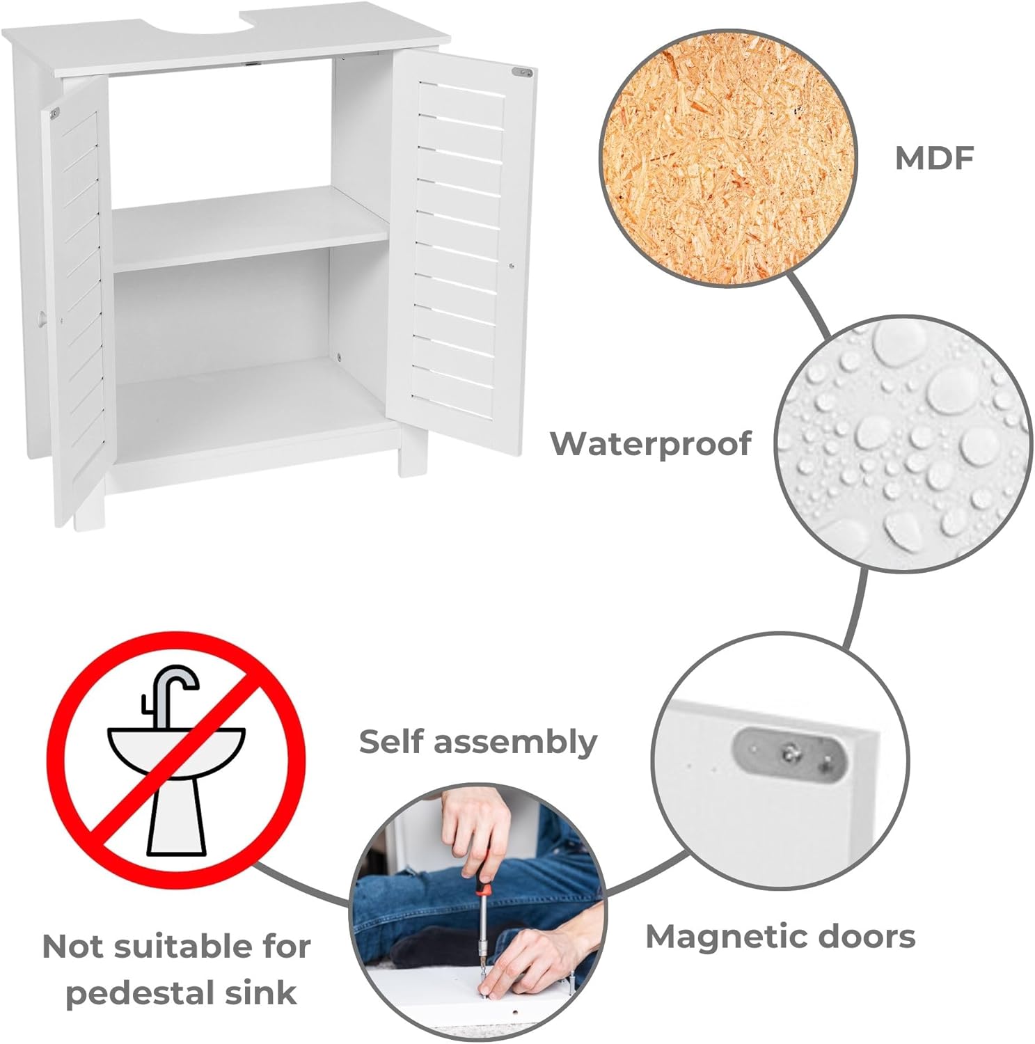 | Additional Features | Double Vented Doors: Elegant double louvered doors provide airflow, keeping stored items fresh while adding a stylish touch to your bathroom decor., Durable MDF Construction: Made from sturdy MDF material with a smooth white finish, ensuring long-lasting durability and a clean, modern look., Magnetic Closure System: Features magnetic doors for easy and secure closing, providing quick access to stored items while keeping them safely enclosed., Space-Saving Design: Compact and efficient, this cabinet is perfect for maximizing storage in smaller bathrooms without compromising on style., U-Shaped Cut-Out: Designed to fit seamlessly under most sinks, the U-shaped cut-out maximizes cabinet space while accommodating sink pipes. |