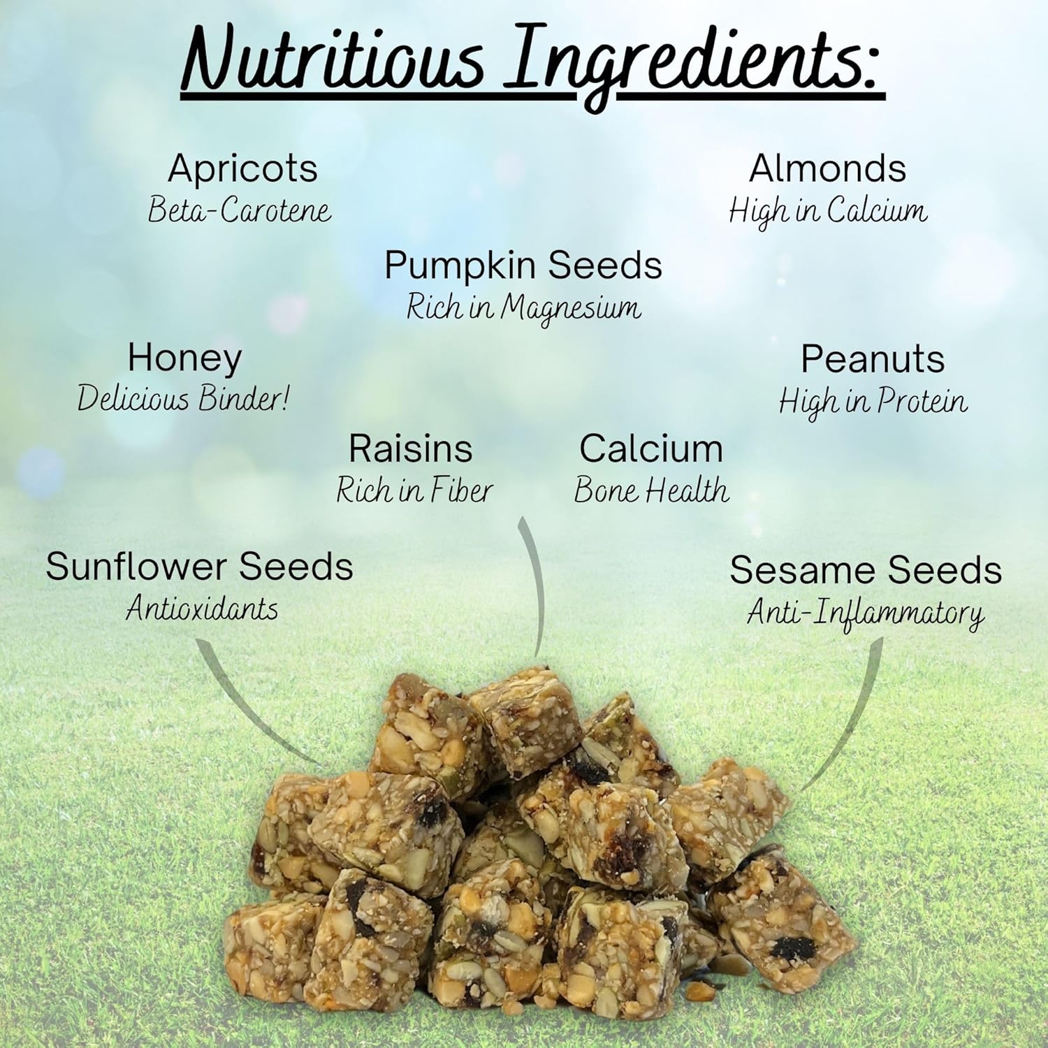 Squirrel Beneficial Blocks from Exotic Nutrition are composed of 100% all natural ingredients including natural California almonds. Fortified with calcium, they make a nutritious supplemental food option for squirrels and other small mammals. These blocks will encourage foraging behavior and serves as a source of quality protein and fiber along with minerals for a well-rounded diet. Plus, they are easy to serve and enjoyable for your pet to snack on.SIZE: Net Weight: 7.5 oz.FEATURES: ✔ NUTRITIOUS - These blocks provide a nutritious way to add protein and fiber to the diet✔ FORAGING - Stimulates your pet's natural urge to forage for food✔ VARIETY - Lends variety to an otherwise monotonous diet✔ DENTAL HEALTH - Provides good exercise for teeth and jaws✔ ENRICHMENT - Adds behavioral enrichment for animals that spend their lives in a small, limited environment. ✔ BONDING - Forms a connection between pets and pet owners, assisting in bonding and training.Ingredients: pumpkin seeds, almonds, sunflower seeds, sesame seeds, peanuts, honey, raisins, soy flour, apricot, calcium carbonate.Guaranteed Analysis: ccrude protein 22.0% (min), crude fat 38.0% (min), crude fiber 9.0% (max), moisture 7.5% (max), calcium 0.7%, phosphorus 0.45%, magnesium 0.29%, potassium 0.72%, zinc 49.0 ppm, copper 18.0 ppm. Calories: 5.8 kcal/g.Feeding Instructions: Offer 1-2 blocks per day along with Squirrel Complete. Always provide fresh, clean drinking waterStorage: Store cool and dry. Keeps for 6 months, or refrigerate or freeze for longer storage. Thaw before feeding if you freeze the product.