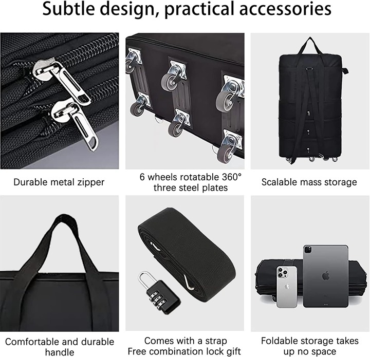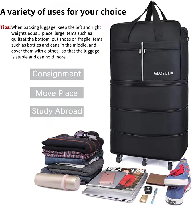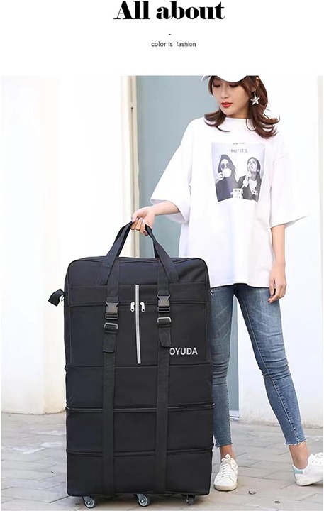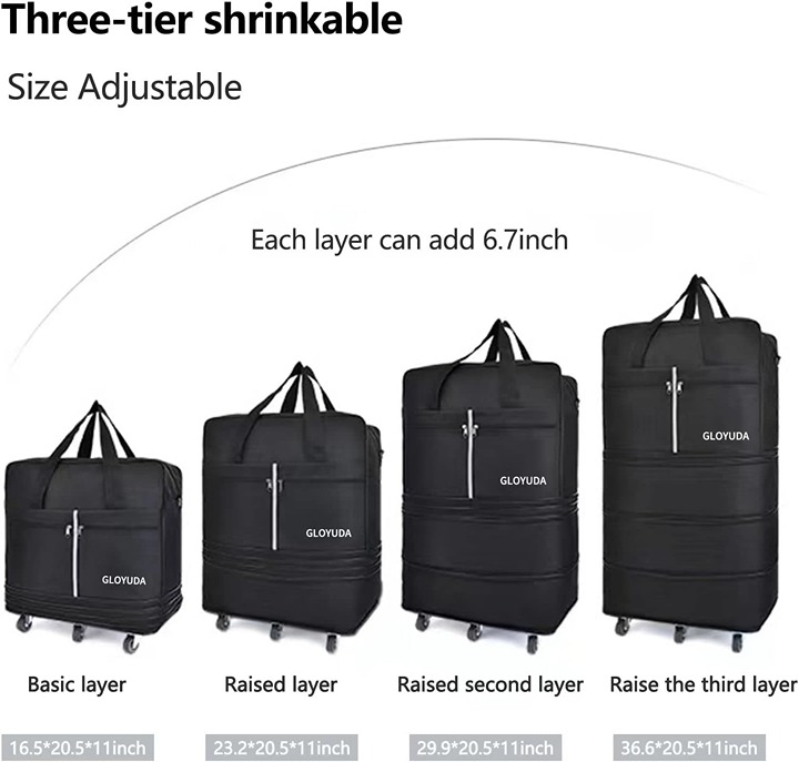【Expandable Dimension】There are four layers of the foldable suitcase with wheel, the basic size of the rolling expandable duffel bag is:16.5 in (H) x 20.5 in (L) x 11 in (W); First zipper opened:23.2 in (H) x 20.5 in (L) x 11 in (W); Second zipper opened:29.9 in (H) x 20.5 in (L) x 11 in (W); Third zippers opened:36.6 in (H) x 20.5 in (L) x 11 in (W). The expandable duffle bag folds down to a compact 19 in x 11 in x 3 in easy-to-store pouch when not in use.