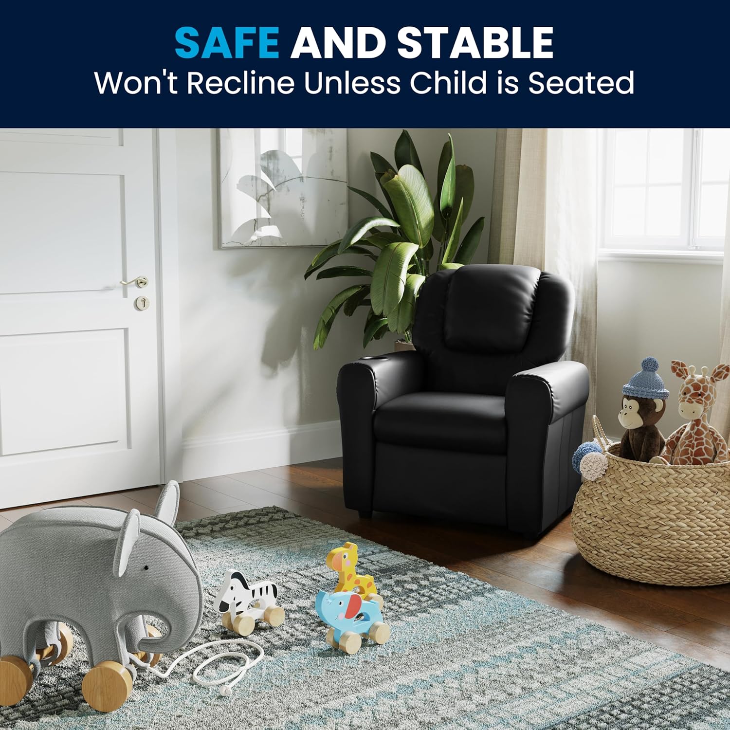 Don't forget about the kiddos, fur babies included, when looking for child-sized seating. Young kids will enjoy the comfort that adults experience on this comfy recliner. This plush recliner comes with a built-in headrest, footrest, and a cup holder to free up little hands and help prevent spills. Cats and small dogs can also curl up on this push-back recliner and the cup holder can double as a treat cup for rewarding your pets good behavior. Kids can enjoy watching tv, playing games or reading in this adorable recliner which keeps them occupied in comfort. Cleanup is a breeze with the vinyl upholstery that wipes clean with a water based cleaner and is durable around active children. With a solid hardwood frame this kids recliner holds up to 90 pounds and includes a safety feature that prevents the seat from reclining until the child is seated and the ottoman is pulled out one inch. This child-sized reclining chair assembles in less than 10 minutes with the included step-by-step instructions and will quickly become your child's go-to chair. Add this upholstered recliner to your living room, playroom, or child's bedroom.
