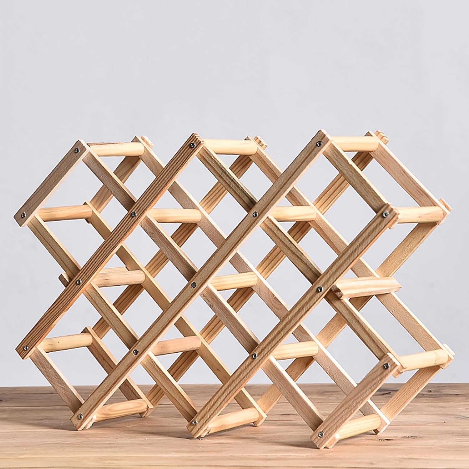 Our wine rack is perfect for both regular bottles. If you have an impressive wine collection, with nowhere to store the bottles, this is a clever space-saving solution that‘s as practical as it is attractive. The freestanding design means it‘ll be a stylish addition to any kitchen countertop or home bar.The wine rack is foldable design, no need to assemble, ready to use out of the box.It folds easily and could be stored anywhere without occupying much space when not in use.This wine rack is made of high quality solid wood, is very durable. Advanced retro country style make the wine rack look elegant and chic.Each wine bottle is stored horizontally ensuring both the wine and the air bubbles are in contact with the cork.Keeping corks moist enables wine to stay fresh longer until you're ready to enjoy.Simple and compact wine display rack you will ever have. It is suitable for counter top, bars, kitchen cabinets, tabletops, and any decoration.Wine racks dataColor:Charcoal Color, wood ColorMaterial: Solid woodNumber of bottles: hold up to 10 wine bottles .