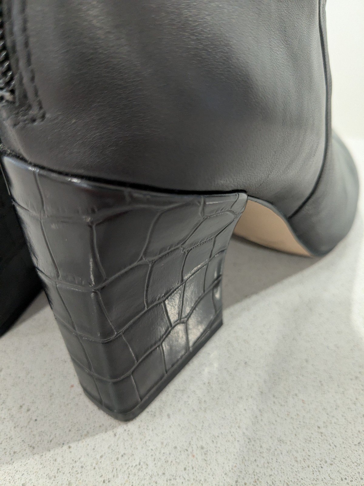 Franco Sarto Venture Black Leather short boots with zipper and a faux crocodile heel. The heel is approximately 3" high. They are a size 9.5 US. They are in excellent like new condition with no flaws that I can see. I think they may have been worn once or twice. No box.