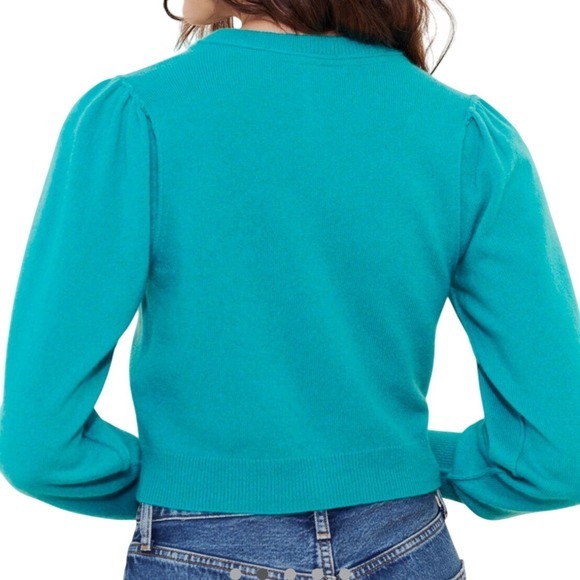 Wrap yourself in delightful charm with this vibrant teal blue cropped cardigan, a true testament to chic comfort. Feel the soft cashmere hug your form as the elegantly puffed sleeves add a touch of whimsical flair, creating a silhouette that's both modern and timeless. The delicate pearl buttons glimmer, adding a sophisticated sparkle to this eye-catching piece. This versatile cardigan is perfect for layering over a camisole for a casual day out, adding a pop of color to a monochromatic outfit, or even dressing up a simple tank top for an evening gathering.