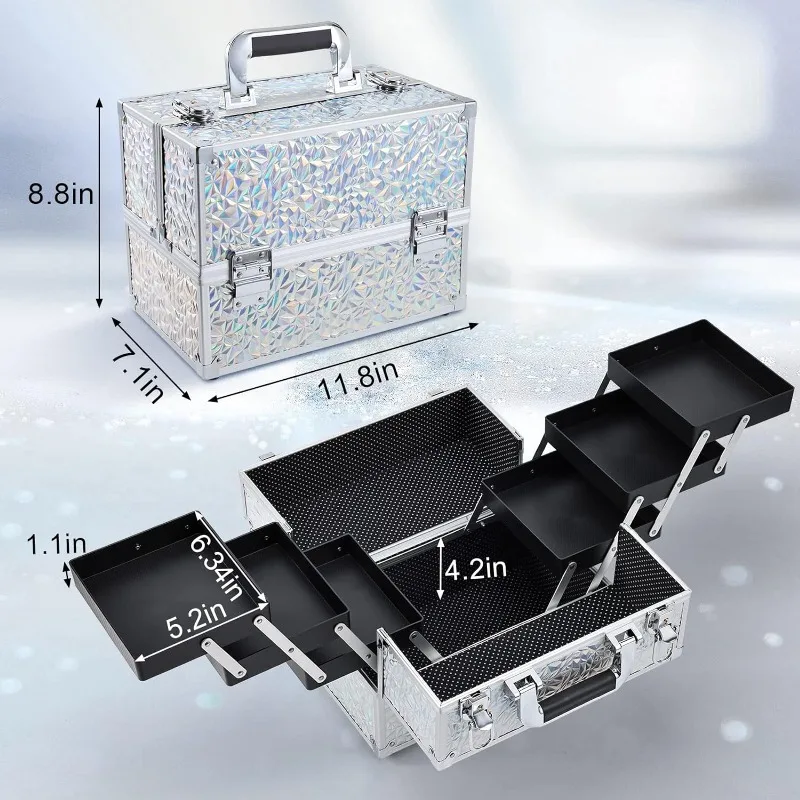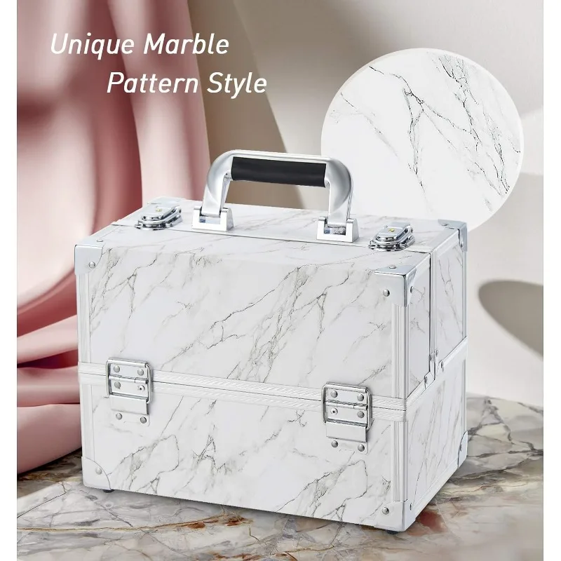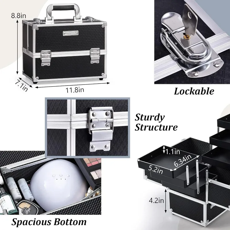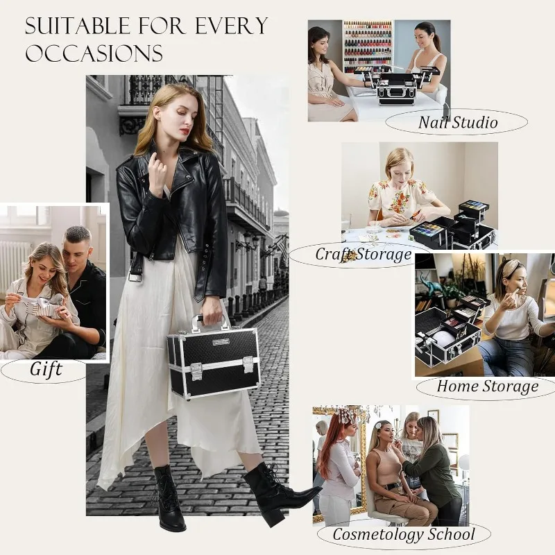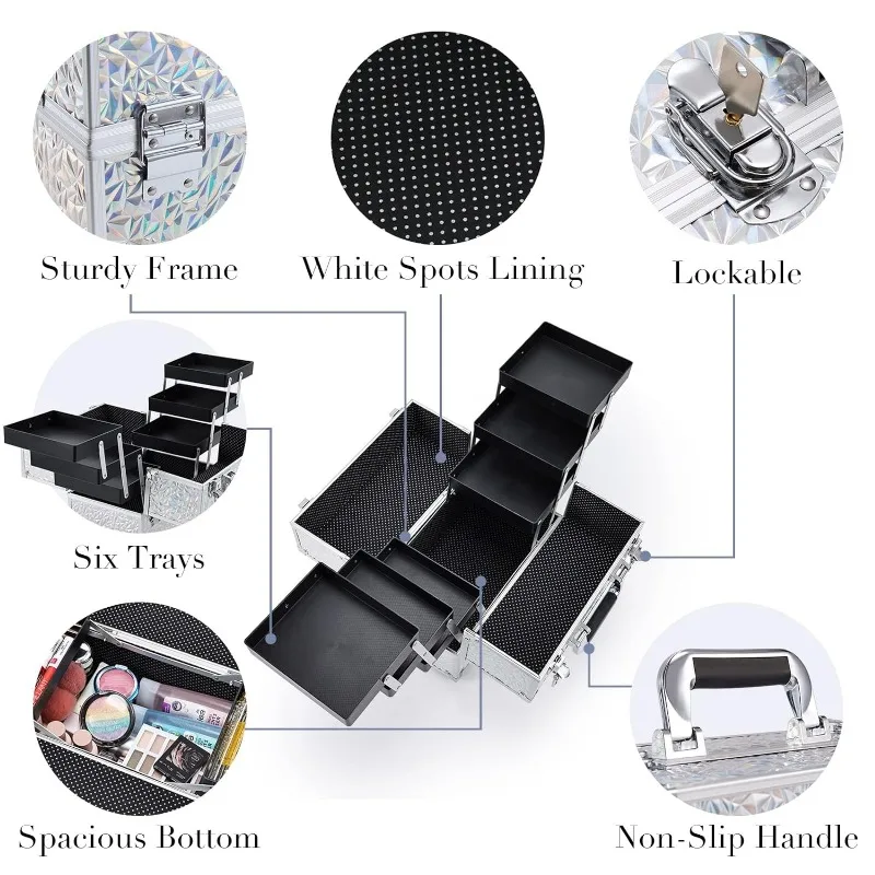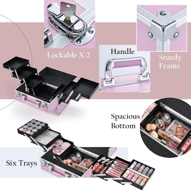 • Makeup Train Case with 6 Trays: This size makeup case is 11.8 x 7.1 x 8.8 inches. The extendable cantilever 6-tiers tray structure along with the spacious bottom ensures roomy space. The unique white spots lining design is a perfect gift for women and girls. Storage is flexible to fit in various sizes of cosmetic products such as your toiletries, nail polish, essential oils, jewelry, paintbrush, and crafting tools. There is large bottom space for palettes and even travel-size bottles.