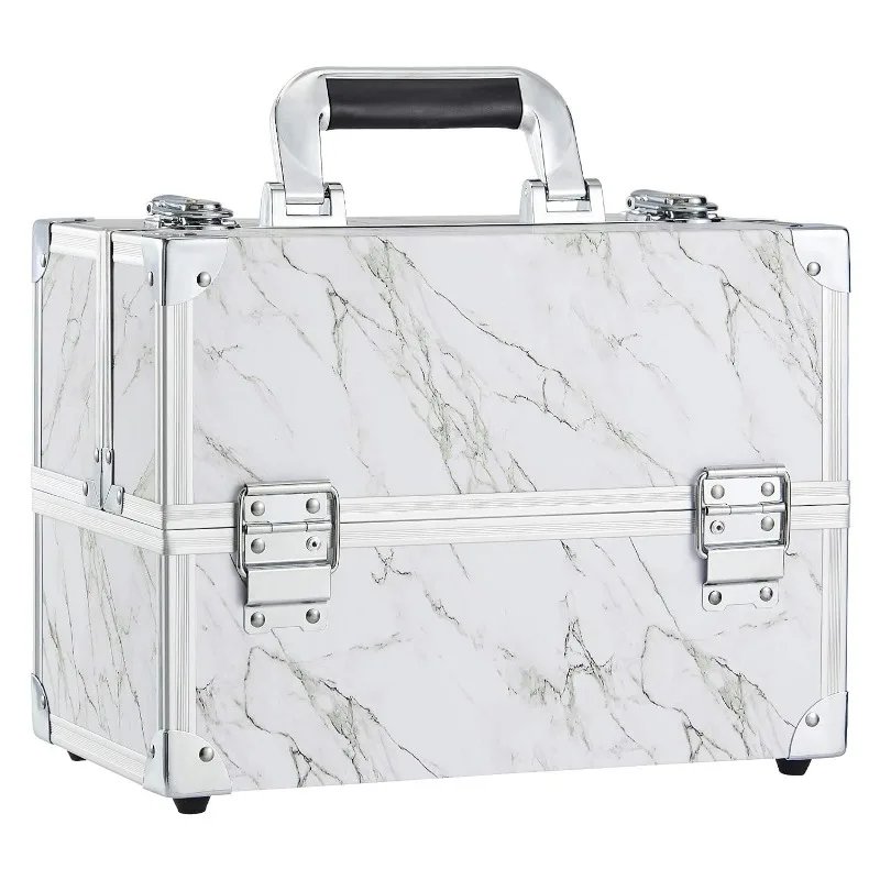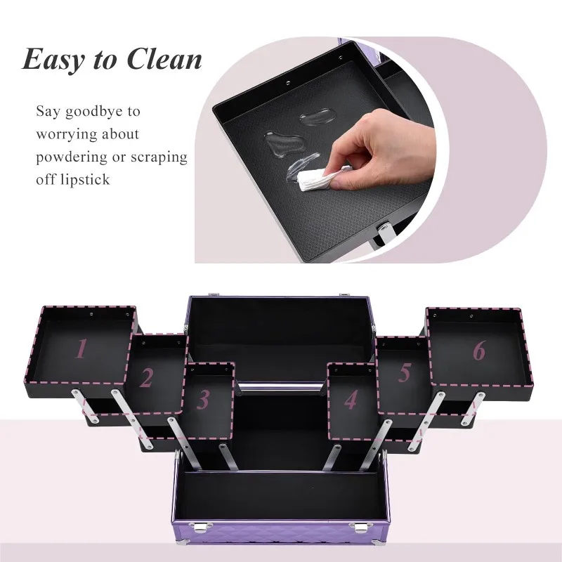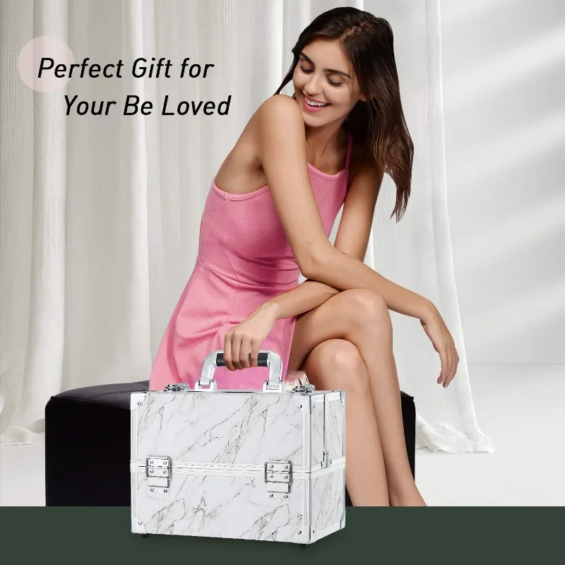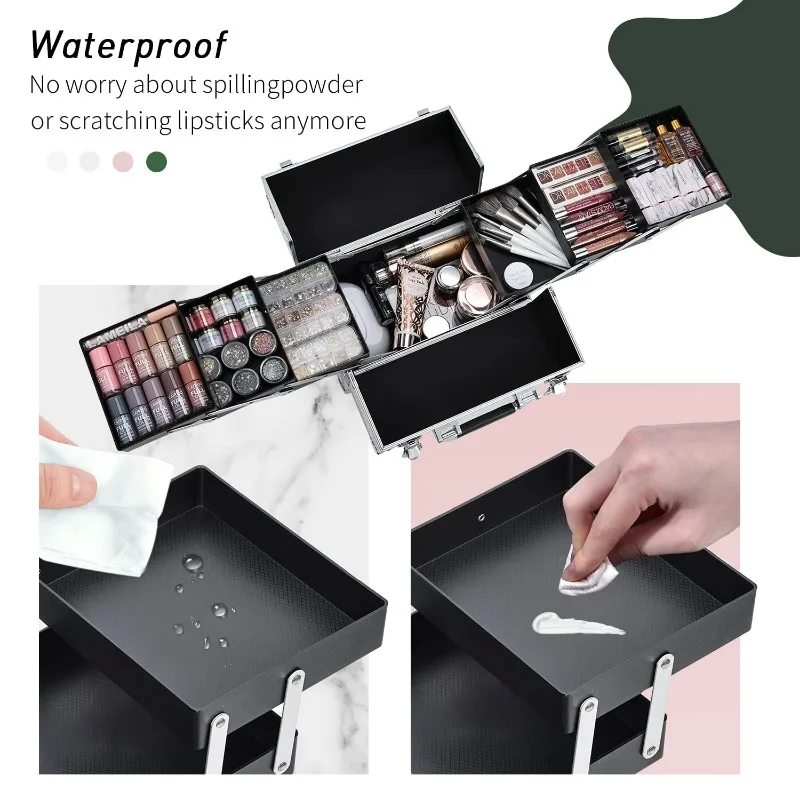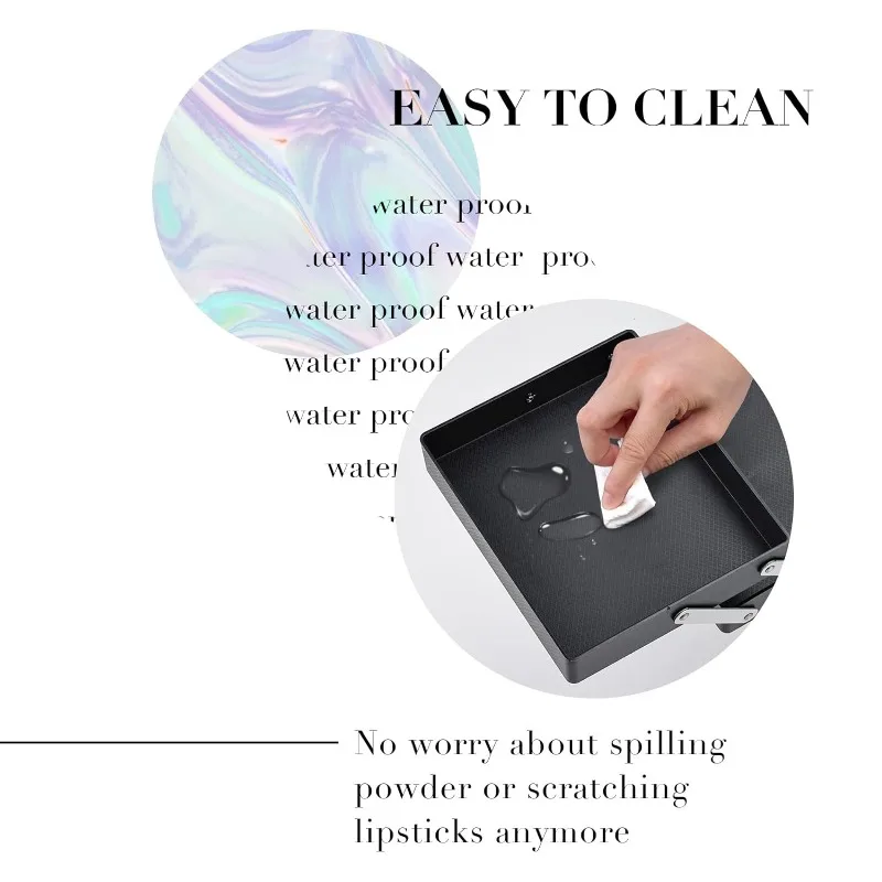 • Durable and Protective: Durable and sturdy Grade-A Aluminum on all frames and a high-quality structure for extra durability and protection. Don't worry about the breaking of the glass container; Wipe-able fabric can easily wipe up stray makeup; Soft non-slip handle to grab your case and go. The waterproof surface makes this cosmetic box an excellent protector for outdoor cosmetics.