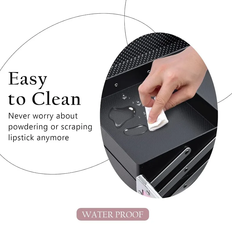 • Easy to Clean: No worry about spilling powder or scratching. When your lipstick stains the trays, just wipe the surface with a damp cloth and it will be as new as ever.