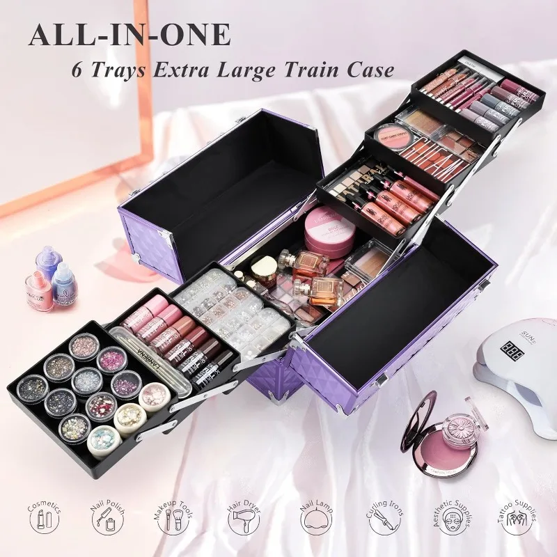 FRENESSA Makeup Train Case 12 Inch Large Portable Cosmetic Case - 6 Tier Trays Professional Makeup Storage Organizer Box Make Up