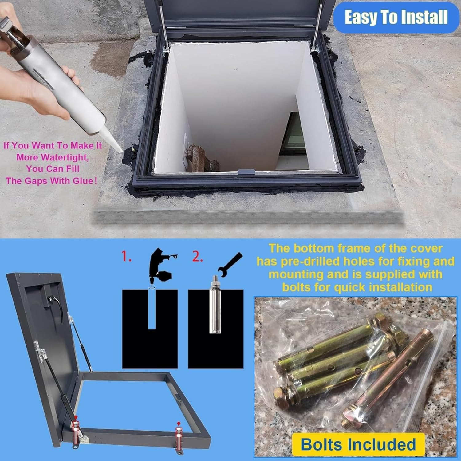 Enhance the security and accessibility of your attic or roof area with our premium roof hatch. Constructed from durable galvanized metal, this hatch ensures long-lasting performance while its sleek dark gray finish seamlessly integrates with your roofing. Our roof hatch offers customizable options to meet your specific needs, available in various sizes for a perfect fit in any space. Choose from the following inner and cover diameter options to find the ideal match for your project: - Inner Diameter 500 mm (Cover Size 610 mm) - Inner Diameter 550 mm (Cover Size 660 mm) - Inner Diameter 600 mm (Cover Size 710 mm) - Inner Diameter 650 mm (Cover Size 760 mm) - Inner Diameter 700 mm (Cover Size 810 mm) - Inner Diameter 750 mm (Cover Size 860 mm) - Inner Diameter 800 mm (Cover Size 910 mm) - Inner Diameter 850 mm (Cover Size 960 mm) - Inner Diameter 900 mm (Cover Size 1010 mm) - Inner Diameter 950 mm (Cover Size 1060 mm) - Inner Diameter 1000 mm (Cover Size 1110 mm) For optimal installation, ensure that the bottom's inner diameter is equal to or larger than the wellhead opening size. Key Features: - Inlaid rubber sealing strip to prevent rainwater ingress, providing a dry and safe environment. - Convenient handle design allows for effortless opening and closing of the hatch. - Pneumatic hydraulic support rods operate smoothly and silently, keeping the hatch cover at a 90° angle without the risk of accidental closure due to wind. - Pre-drilled bolts included for easy installation, making setup a breeze. Applications: This roof hatch is ideal for various uses, including home improvement projects, industrial applications, commercial properties, and educational institutions. Installation Instructions: 1. For improved sealing, consider applying adhesive to any gaps. 2. Secure the hatch cover to the ground using the provided bolts. Experience the perfect blend of functionality and durability with our roof hatch, making your access to overhead spaces safer and more c...