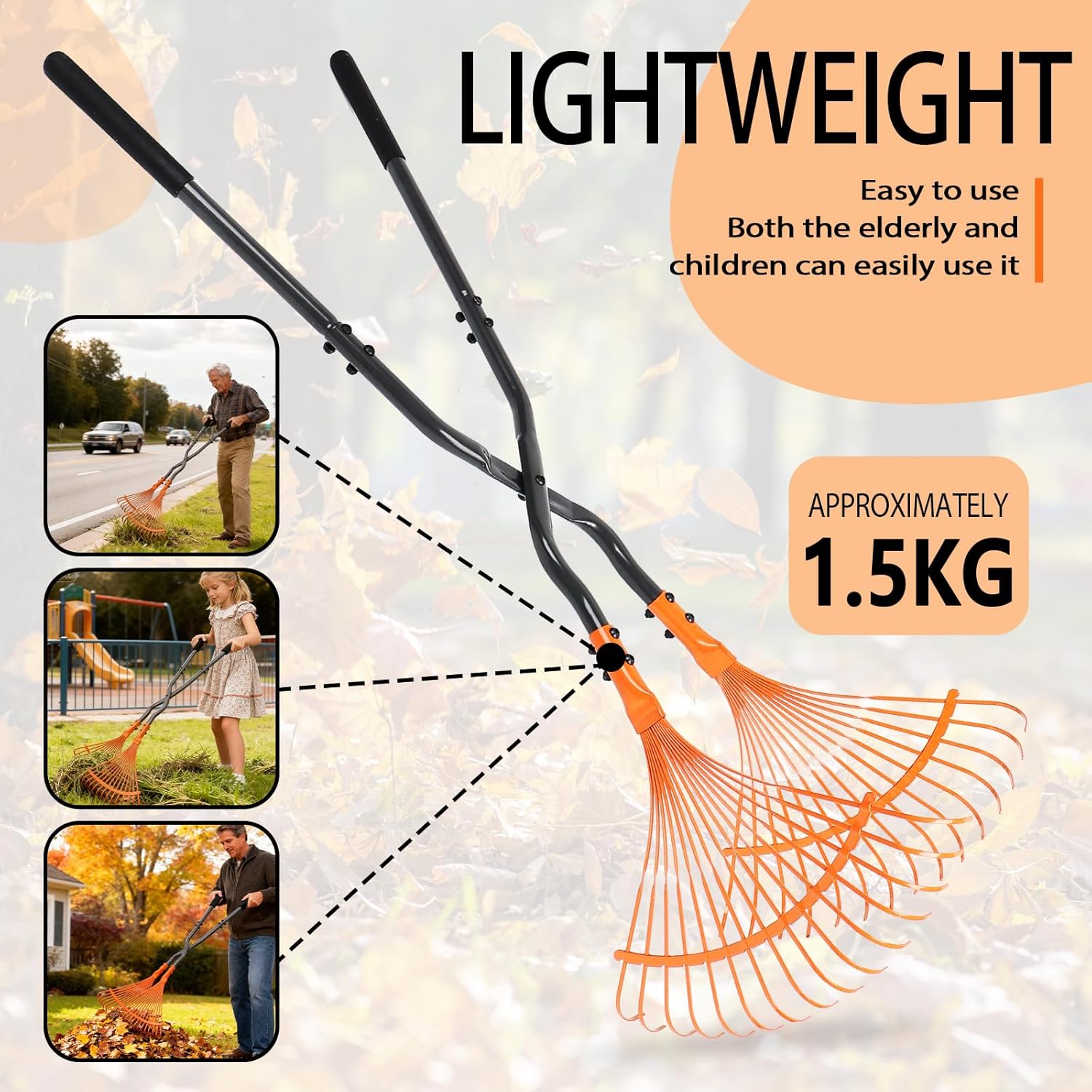 Introducing the JUANYUE rake, a versatile gardening tool designed for efficient yard maintenance. This rake features an innovative fan-shaped head with multiple tines arranged in an expanding pattern, providing excellent coverage for gathering leaves, grass clippings, and garden debris. The durable construction combines a sturdy black handle with flexible orange tines that effectively capture materials without damaging your lawn. The ergonomic handle design reduces strain during extended use, while the wide rake head helps you complete yard work more quickly. Perfect for both spring and fall cleanup tasks, this rake makes light work of maintaining your outdoor spaces. The balanced weight distribution and thoughtful design make it suitable for users of various heights and strengths. Whether you're clearing fallen leaves, preparing garden beds, or maintaining your lawn, this rake delivers reliable performance for all your landscaping needs.
