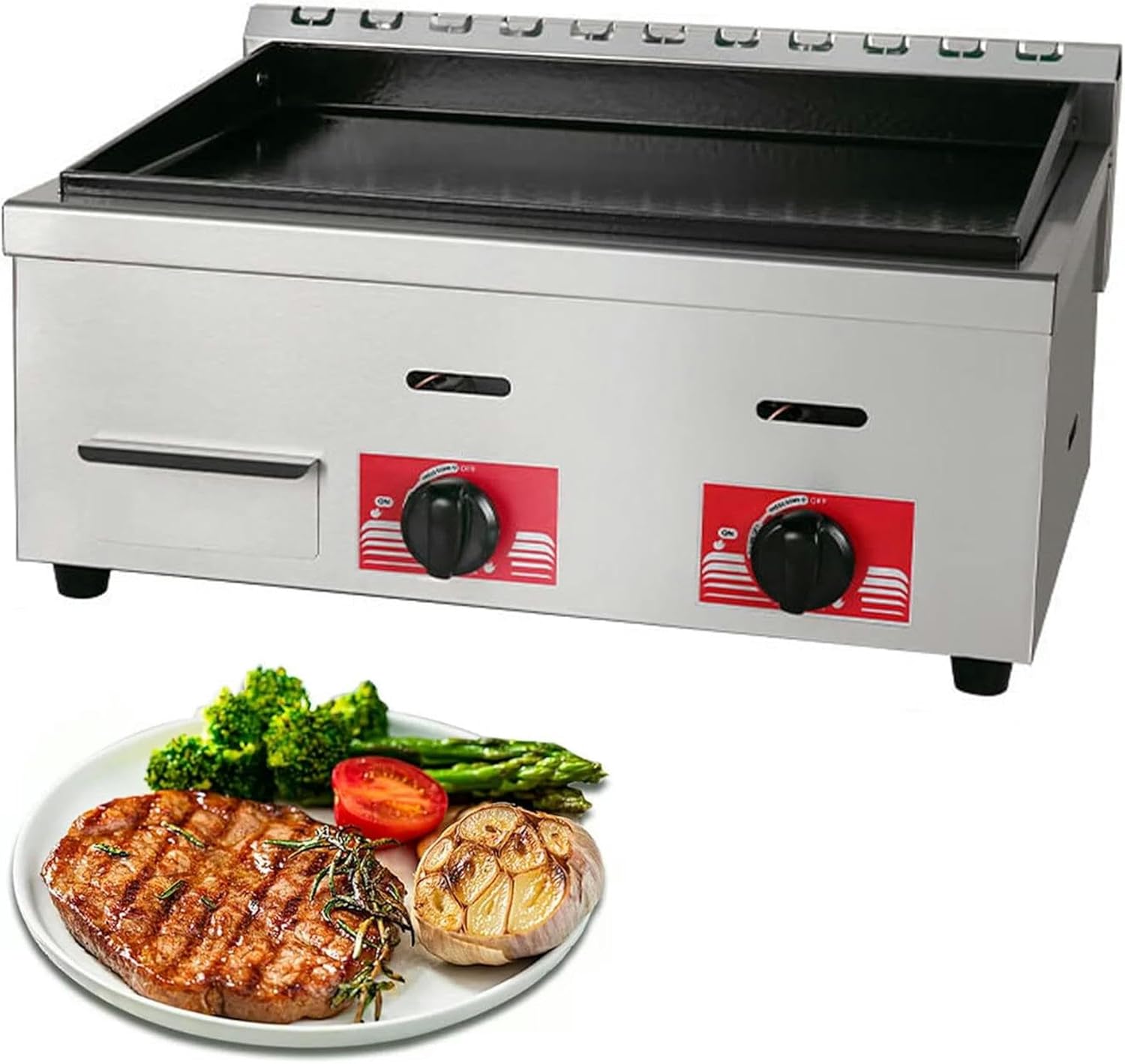 Model Number:Powerful Efficient Griddle with Great Cooking PerformanceGreat for whipping up bacon, burgers, cheesesteaks, and more at your busy snack bar, concession stand, or restaurant, this countertop griddle is an efficient and durable addition to your kitchen. Independent controls and versatile features allow you to customize this unit to meet your needs!Commercial Heavy Duty Manual Griddle Gas Countertop: Uniform Heating & Large Cooking AreaDurable stainless steel structure, corrosion-resistant and easy to clean. Independent manual controls to save the energy. Thick stainless steel radiant plate, for quick and even heating. With a countertop design, the unit is space efficient, leaving room in your kitchen for additional equipment, supplies, or work surface area. It also allows placement on top of existing work tables and chef bases, ensuring that your space is maximized to its full potential.Wide ApplicationCan be used at home or in commercial places,Perfect for processing pancakes, crispy bacon, grilled cheese,full breakfast, fried dishes, omelet, pizza, steak, burger.Package Content:1x countertop griddle grillTIPS: Before using the griddle for the first time, using dishwashing liquid and water to clean the cooking plate, then heating. Finally, apply a layer of oil to avoid the plate to be rust.