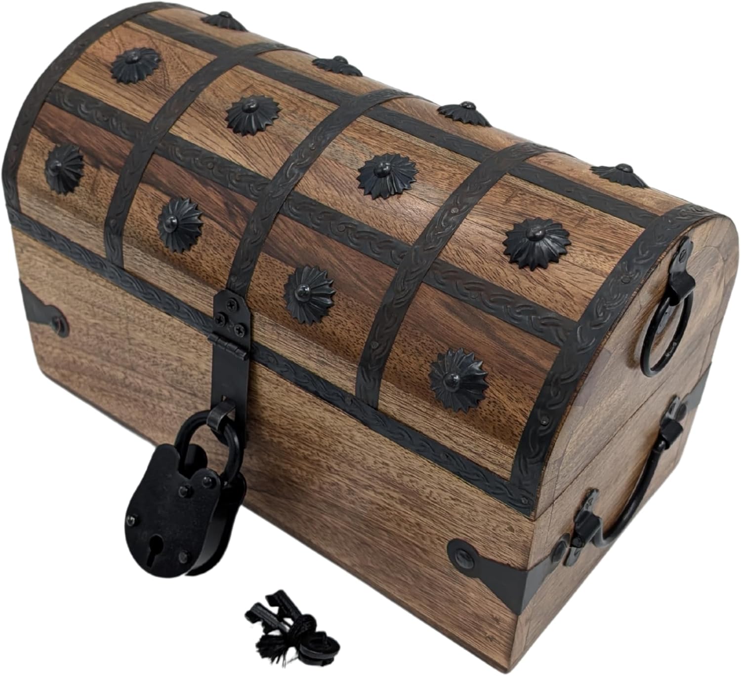 Handmade from rich, beautifully grained teak or mango wood (depending on season) and finished with real iron hardware, this storage chest brings character, charm, and coastal elegance to any space. Each piece is crafted by skilled artisans, offering a one-of-a-kind decorative accent with timeless appeal. Use it to store jewelry, keepsakes, letters, or trinkets, or simply display it as a rustic statement piece in your living room, bedroom, or office. Its rugged look pairs perfectly with nautical decor, vintage furnishings, or beach-inspired spaces. Whether you're creating a memorable treasure hunt outdoors, gifting something unique, or elevating your home with a handcrafted detail, this chest adds warmth, style, and a sense of adventure to any setting.