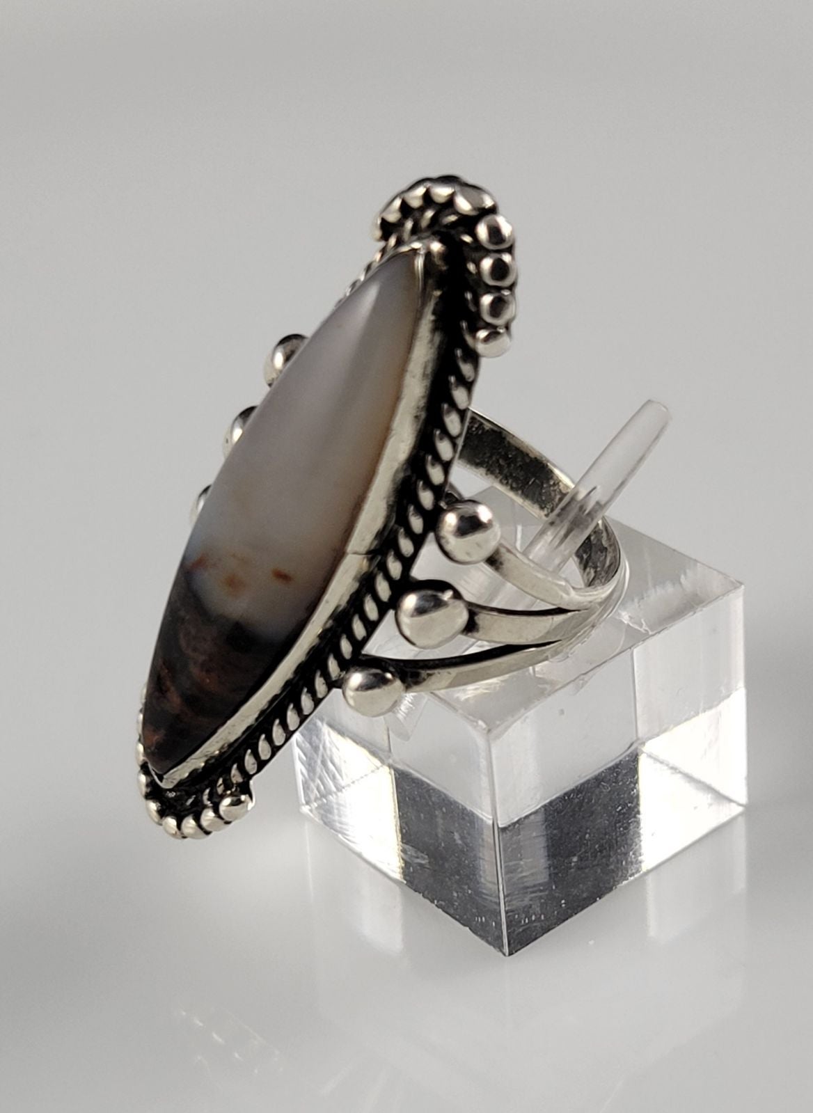 Genuine Landscape Agate set in a handmade, solid sterling silver setting. A strong triple shank supports the large piece of agate. Very unique ring!