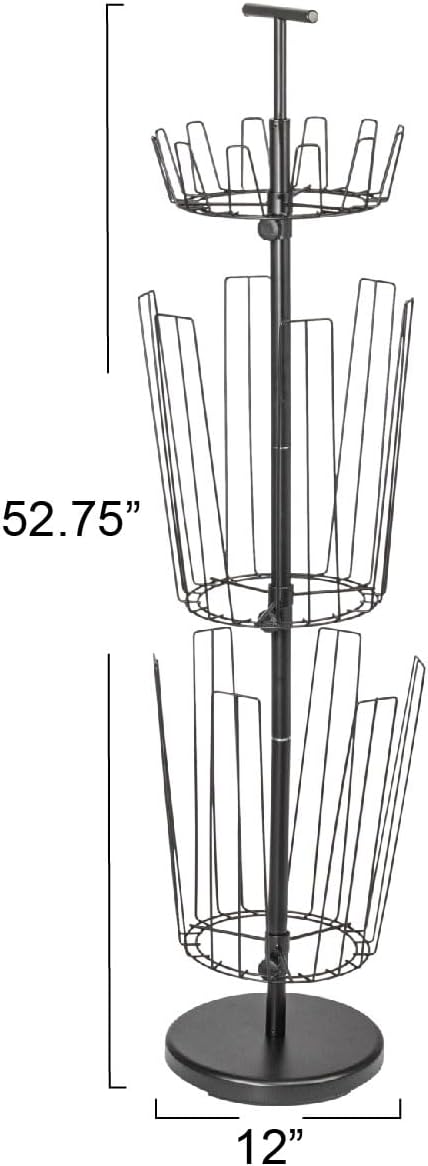 This boot-tree style shoe rack holds up 18-pairs of shoes on 3-spinning tiers. Its weighted 12 in. diameter base lets shoes store vertically saving space in the closet. Perfect for most boots. Sturdy, stable and easy to assemble. Screw together steel center pole and adjustable tiers. Also, great storage for accessories.