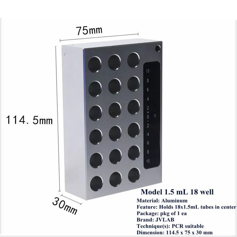 The use of this product can minimize the occurrence of operating errors and template contamination, and bring more convenience to the experimental work of PCR operators.Material: AluminumHole: 1 well / 4 well / 6 well / 8 well / 18 well / 24 well / 96 wellSuitable for tube: 0.2 mL / 1.5 mL / 2 mL / 5 mL / 15 mL / 50 mLPackage: 1 / PK1.5ml 18 well0.2ml 96 well2ml 24 well5ml 8 well15ml 6 well50ml 4 well50ml 1 wellAttention please!There is foam and silicone rack suitable for this pcr cooler, if you need please click here for purchasing. Thank you.==========Hign-concerned Chemical : noneModel Number : PCR-CoolerOrigin : Mainland ChinaClassification : Centrifuge TubesMaterial : AluminumPackage : 1 / pk