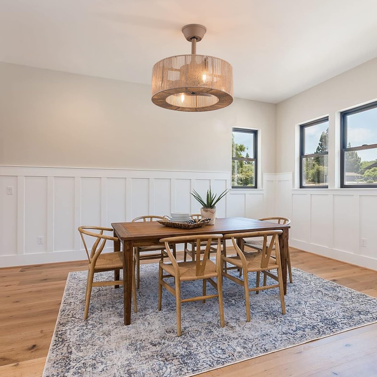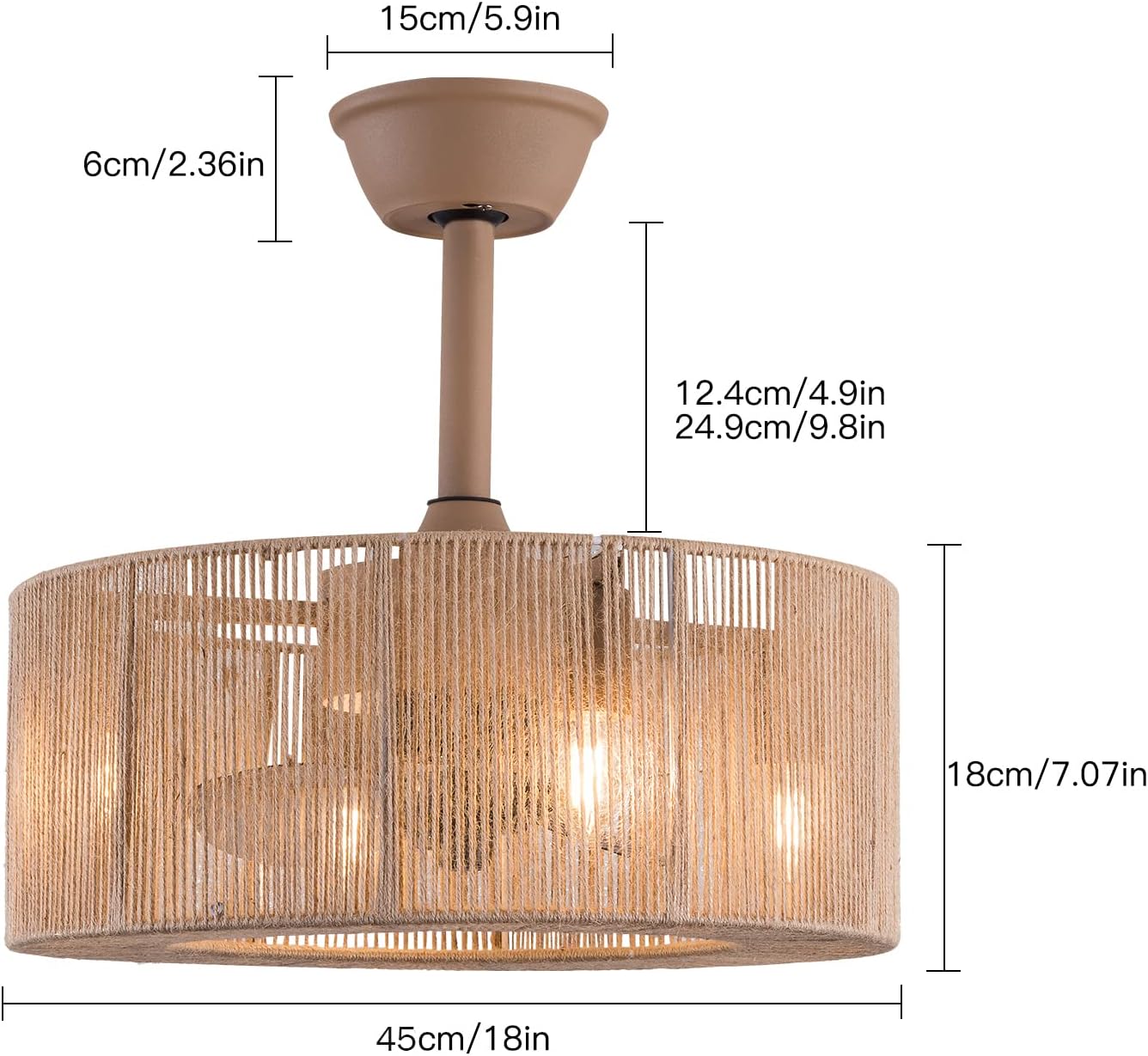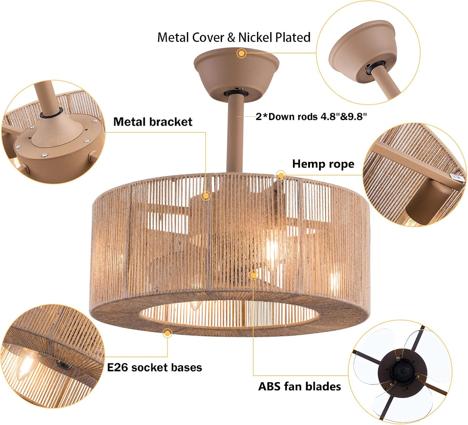 About this itemSuit for ceiling from 7.5-11.5 feet, and room from Room Size 86ft*162ft children room, bedroom, kitchen island or dinning room。Easy to install: hard wire. perfect design to illuminate your space, whether it is a kitchen island, dining room, bedroom, foyer or any other place.3 Gear Wind—The enclosed ceiling fan speed vary from soft to cool, match daily needs; ABS fan blades, durable, lightweight and easy to clean.Timing Function—Smart timing set to automatically POWER OFF light and fan after you fall asleep。Mute Motor—Indoor/Outdoor ceiling fan is equipped with a whisper wind motor which makes no noise, stay away from any noise interference while providing a quiet and comfortable environment✦DimensionsFixture Height: 7.08" (18 cm)Fixture Width: 18" (48cm)✦Bulb InformationBulb requirements: use (4) E26bulbs, maximum 60watts, options include incandescent, fluorescent, LED, halogen, etc. (bulbs are not included)Wattage: Max 60WVoltage: AC110-120VRemote control: yes✦Material and ColourMaterial: Nickel-plated metal + nylon wire&Wood colorPackage Included1 *Fan Light (Bulbs Not Included)2*Down rods (12CM & 25CM)1 * Accessories package1 * User Manual✦Suggestion:1. For a safe and secure installation, please ensure that the electrical box to which this fixture will be mounted is properly attached to a structural member of the building.2. All wires are connected. When unpacking, be careful not to pull with wires as a bad connection may result.3. Do not connect electricity until your fixture is fully assembled.