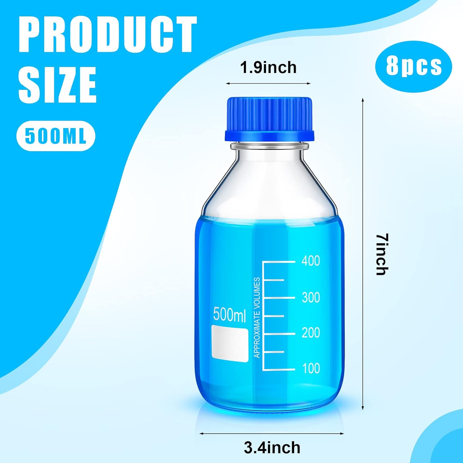 Features: Gift choices: You can give these screw cap glass bottles to those who work as doctors, chemistry teachers, scientists, etc., they may need these useful containers. Practical bottles: Our medicine bottles with caps can not only be applied to medical field, but also suitable for daily use, very practical. Specifications: Main material: Body: borosilicate glass Lid: GL45 Main color: clear and blue Size: Height: about 7.01 inches/ 17.8 cm Body diameter: about 3.39 inches/ 8.6 cm Capacity: about 16.9 oz/ 500 ml Package includes: 8 x Laboratory bottle Notes: Manual measurement, please allow slight errors on size. The color may exist a slight difference due to different screen displays.