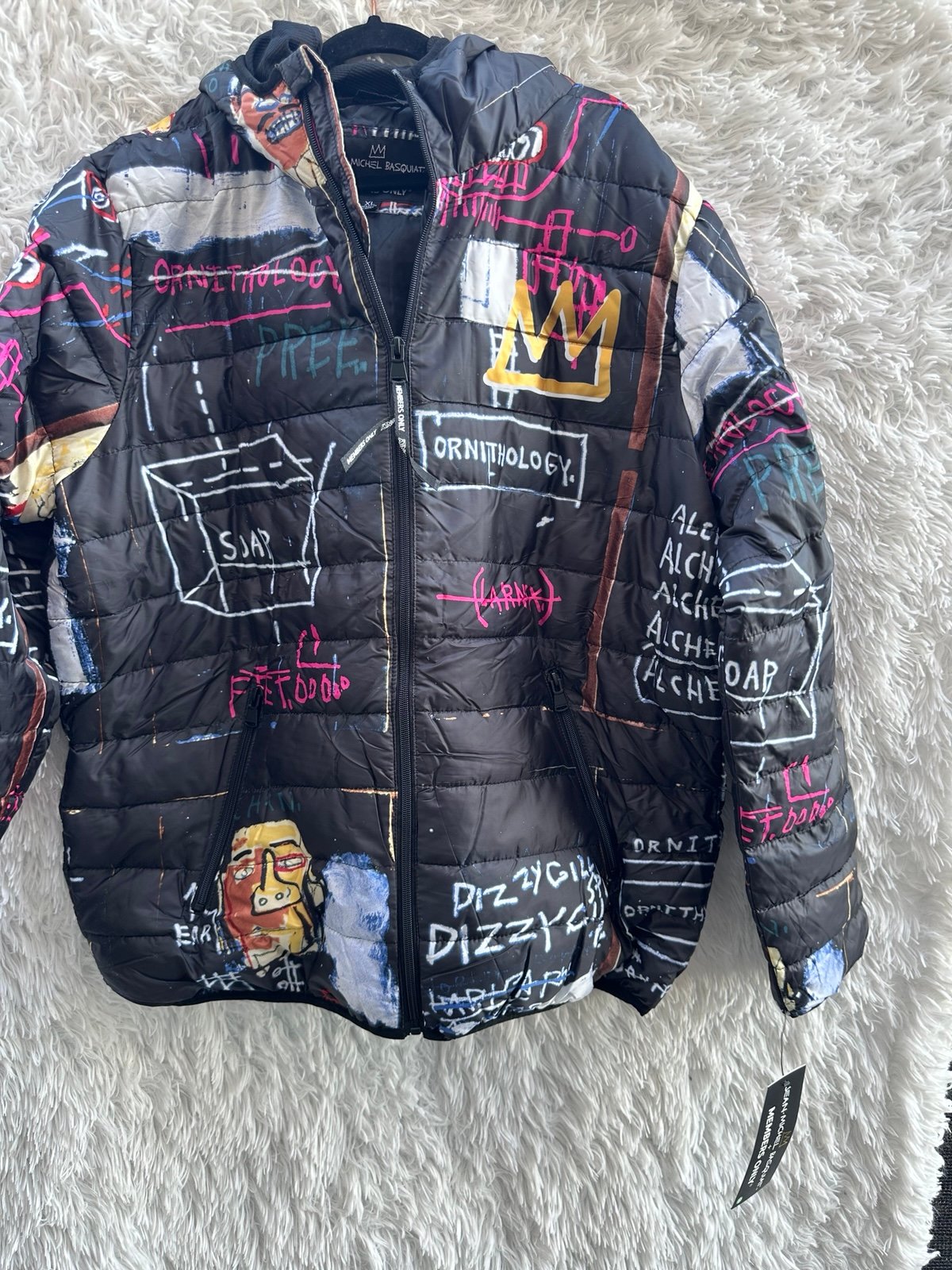 Puffer jacket with bold graphics. Features vibrant lettering and patterns. Eye-catching design. By Jean michel basquiat members only 100% polyester The Jean-Michel Basquiat x Members Only Alchemy Puffer Jacket is a limited edition piece perfect for all seasons, featuring a geometric pattern and a vibrant multicolor design with the iconic Basquiat character. Made of softshell polyester, this mid-length jacket is lightweight and breathable, making it ideal for travel, casual outings, or workwear. With features such as zipped pockets, a hood, and a full zip closure, this puffer jacket offers both style and functionality for those who appreciate hipster, designer fashion with a hint of graffiti art and retro flair.