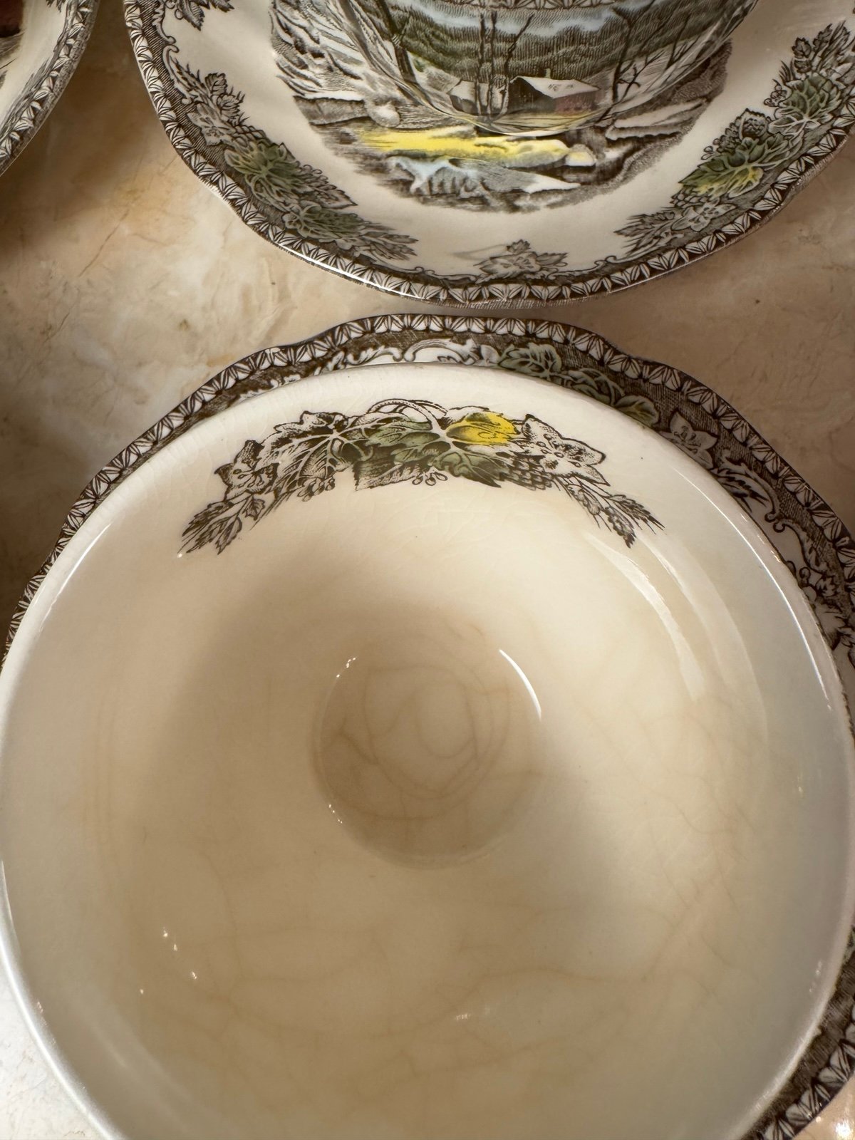 This lovely set of six Johnson Brothers “Friendly Village” teacups and saucers captures the timeless charm of an English countryside winter. Each piece features the classic hand-colored transferware scene “The Ice House,” showing a snow-covered mill and cottages surrounded by trees and a frozen stream. The intricate brown floral border with touches of green, yellow, red, and blue gives each piece a warm, nostalgic feel perfect for the season.