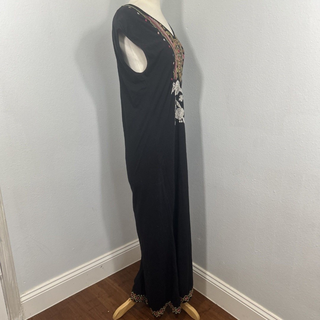 The JWLA Johnny Dress in size small is a stylish and versatile piece perfect for various occasions such as travel, weddings, parties, casual outings, and even formal or workwear events. This black dress features a V-neckline, sleeveless design with cap sleeves, and a pullover closure for easy wear. The dress is made from 100% cotton knit fabric with embroidered accents, adding a touch of bohemian flair. It also has a side slit detail, making it a fashionable and comfortable choice for the summer, fall, and spring seasons. The dress is from the brand Johnny Was and exudes a hippie, beach-inspired theme with Aztec and grunge influences.