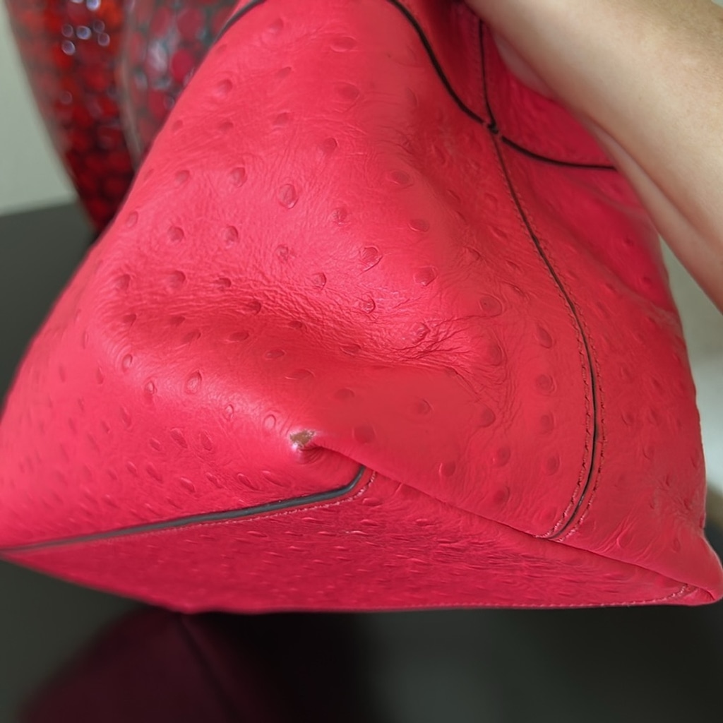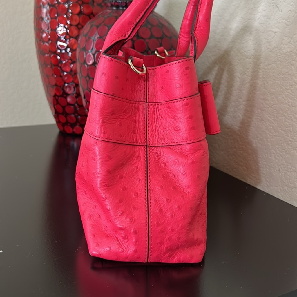 Why it stands out: The bold hot pink ostrich-embossed leather is a fashion-forward pop of color, ideal for adding personality to any outfit. The structured satchel design offers both style and practicality—great for everyday use or as a statement...