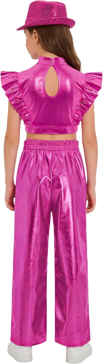 Set Include: 1Pc Crop Top, 1Pc Pants, 1Pc Hat Condition: New with tags Material: 85% Polyester, 10% PU, 5% Spandex Tag No.---|---Recommended Size---|---Pants Length---|----Pants Waist---|-------Hip------|----Top Length----|------Chest-- ---6------|-----------6 Years----------|-----29"/74cm-----|---19.5"/49.5cm---|---31.5"/80cm---|----10"/26.5cm----|---23.5"/60cm ---8------|-----------8 Years----------|----31.5"/81cm----|----20.5"/53cm----|---33.5"/85cm---|----11"/28.5cm----|---25.5"/65cm ---10-----|----------10 Years----------|----34.5"/88cm----|----22"/56.5cm----|----35"/90cm----|----12"/30.5cm----|---27.5"/70cm ---12-----|----------12 Years----------|-----37"/95cm-----|----23.5"/60cm----|----37"/95cm----|---12.5"/32.5cm---|---29.5"/75cm ---14-----|----------14 Years----------|-----40"/102cm----|----25"/63.5cm----|----39"/100cm---|---13.5"/34.5cm---|---31.5"/80cm ---16-----|----------16 Years----------|----42.5"/109cm---|-----26"/67cm-----|----41"/105cm---|----14"/36.5cm----|---33.5"/85cm