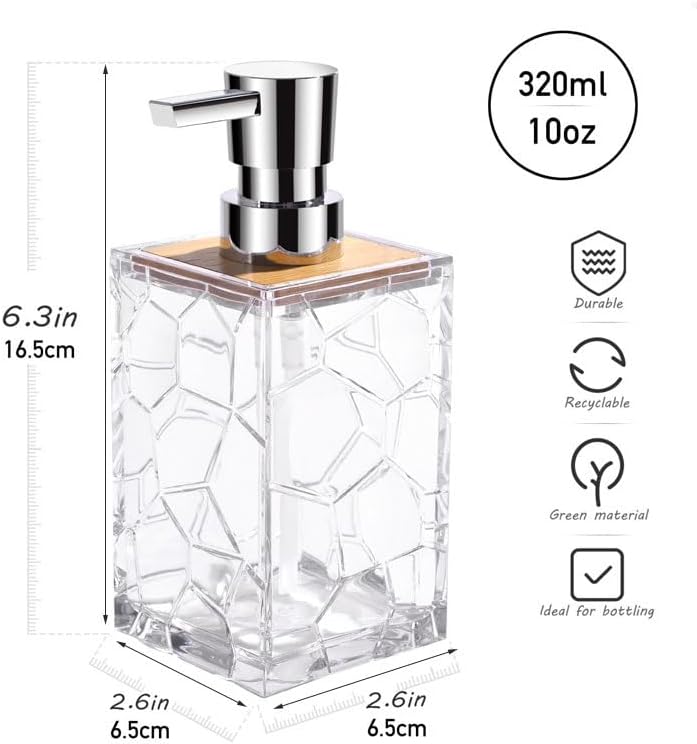 Product category: Soap liquid bottleMaterial: AcrylicCapacity: 320mlSize: 6.5x6.5 x16.5cmWeight: 140gApplicable places: Home, restaurantInstallation method: DesktopCategory: Press typePackaging list: 1 Soap Dispenser (excluding pictures of other demonstration products) Warm reminderDue to the differences in displays, the pictures may not reflect the actual colors2. Due to manual measurement, please allow an error of 1-2cm