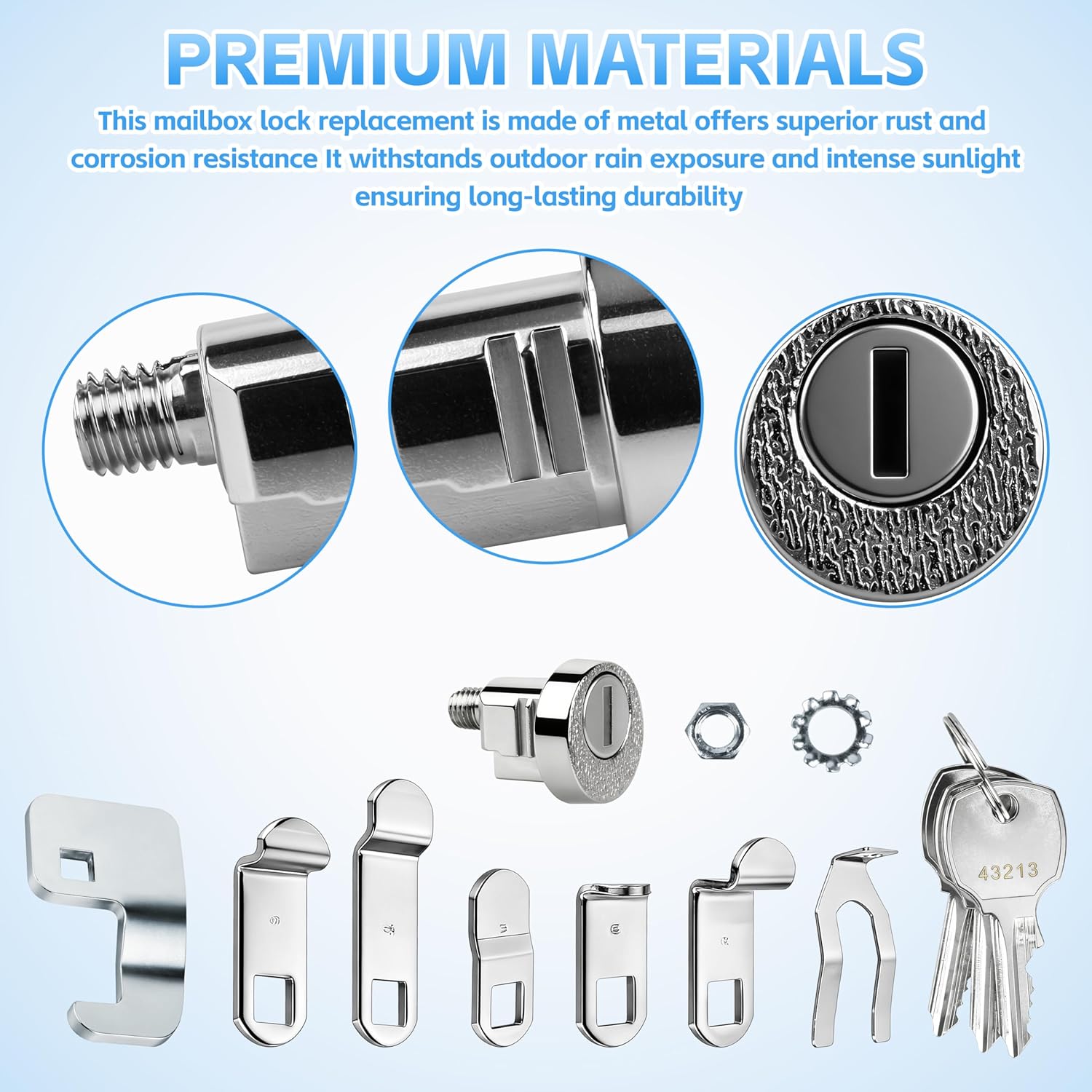 The L-1172C Mailbox Key Lock Replacement is designed specifically for USPS National Mailbox models C9100 and C9200, providing a reliable security solution for your mailbox. This replacement lock comes complete with three keys, ensuring you have backups when needed. The package includes a C7120 cam for proper installation and functionality. Featuring a durable nickel finish, this lock offers both corrosion resistance and a clean, professional appearance that will maintain its look over time. The nickel coating helps protect against the elements, making it suitable for outdoor mailbox applications. Installation is straightforward for those familiar with mailbox lock mechanisms. This single-pack replacement lock is ideal for homeowners, property managers, or mail carriers who need to replace worn, damaged, or lost mailbox locks. The inclusion of multiple keys provides convenience and peace of mind, allowing you to keep spare keys in secure locations. This lock replacement helps restore the security and functionality of your USPS National Mailbox system.