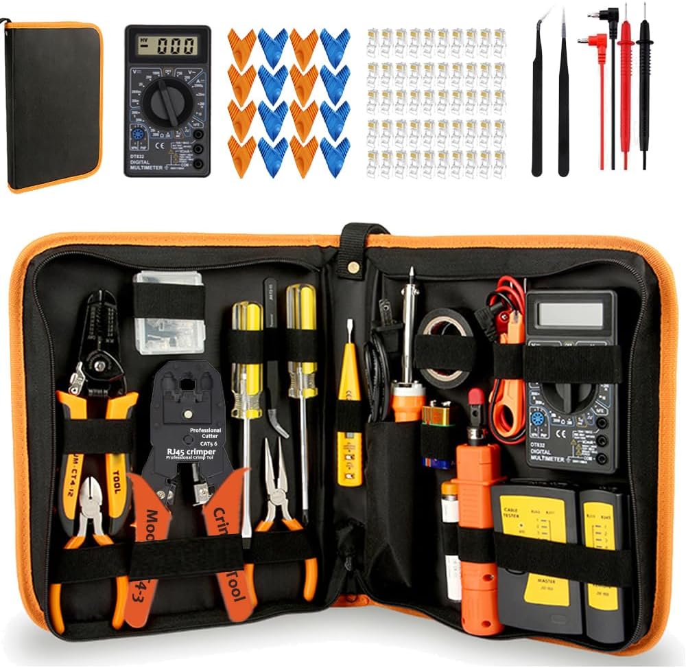 Company: LEATBUY-TECH is a company specialized in producing Tools for 12 years. Smart design and intelligent element are always created by our designers.All tools are bulit with Smooth Cutting, and good for work. Function Features: 1. High leverage and stability for your wiring connections Whether you need to upgrade your network or make fast repairs that will last, RJ45 Crimping Tool by LEATBUY-TECH is your must-have wire terminal tool. 2. It cuts, strips and terminates RJ11/12 and RJ45 extended copper wires with a precision die head that provides 360 degrees of connector support during the crimping cycle. 3. Textured handles provide a non-slip grip for enhanced control and comfort. 4. Long-lasting durability and easy use 5. Our Crimping Tool is made of professional-grade heavy-duty steel so it delivers exceptional torque without bending. 6. Expanded surface area on contact drivers delivers full uniform crimp force for fast, accurate crimping. Packing included: 1 x Network Cable Tester (Battery not included, for testing telephone or network cables) 1 x Network Crimper 1 x Yellow mini Stripping plier 1 x Cross Screwdriver 1 x Straight screwdriver 2 x Stripping Knife 1 x Punch-down tool 50 x Crystal RJ45 network cable connectors 50 x Blue RJ45 network cable connectors 5 x free Blades 1x Zippered Carry Bag