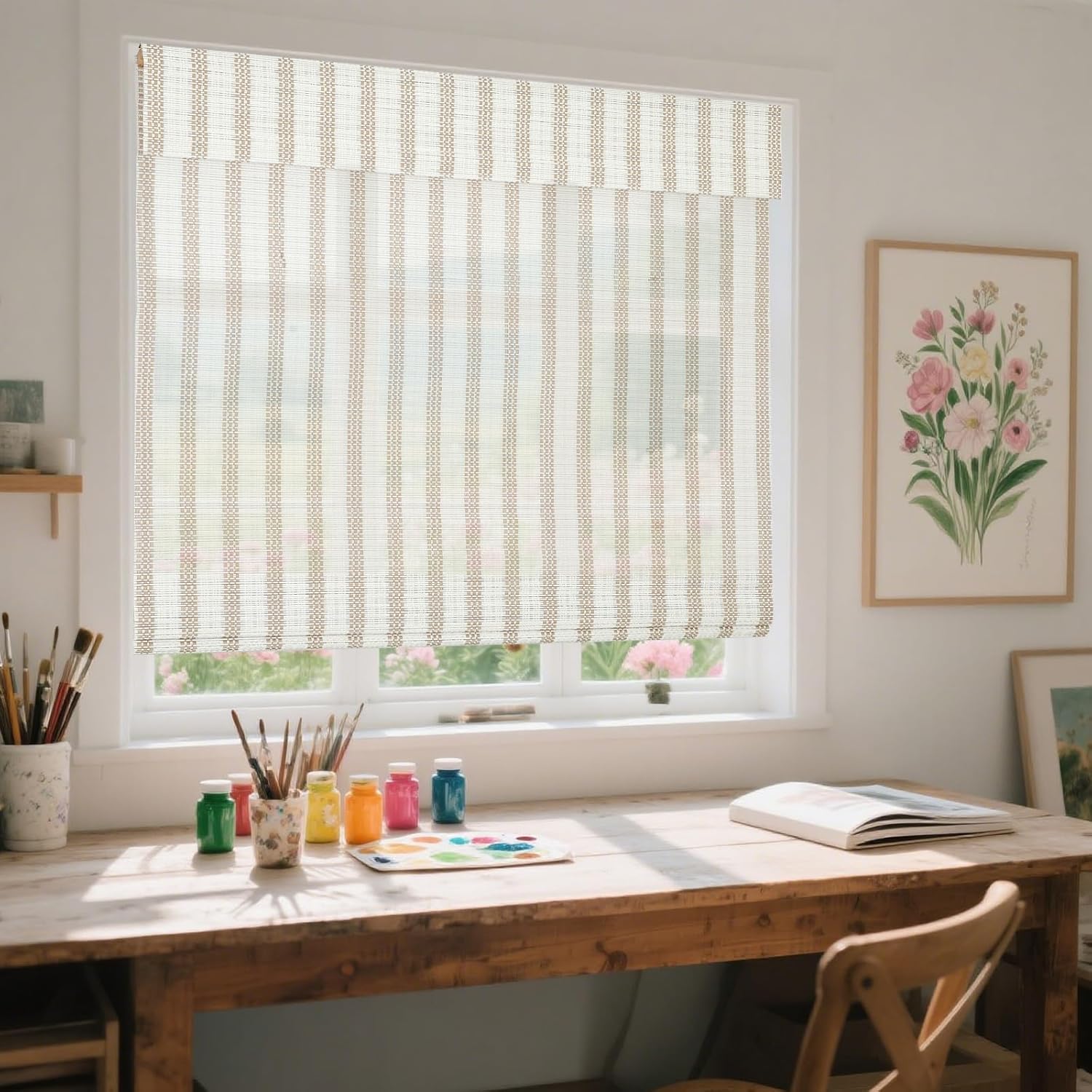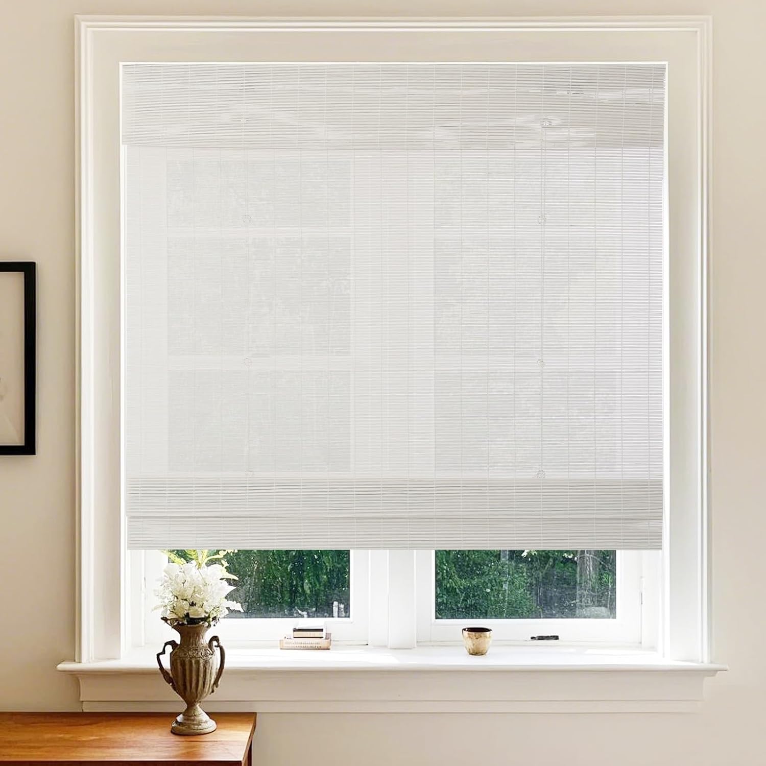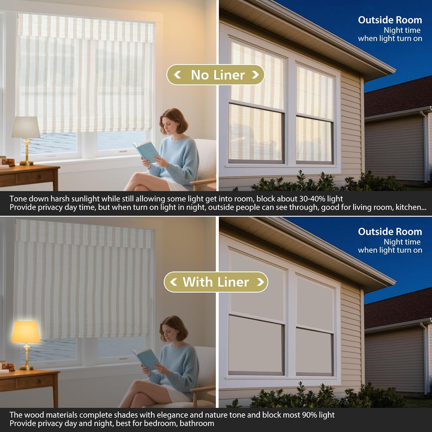The innovative cordless lift system ensures safety and ease of use.No need to drill any holes on your window frame, great for Renter, Landlord, and Home Buyer. Easy to Install in 30 seconds with no tools-no drill, screws, or brackets. These lovely roll-up blinds provide some privacy while enjoying your outdoor living space. The texture of the natural bamboo material gives you a warm and light filtering appearance. Prevent damage exposure by rolling up or taking down the shade during windy or extreme weather conditions. Please note: Do not place your shades in moist, damp environments. Actually the natural bamboo may slightly vary in color from computer monitors colors