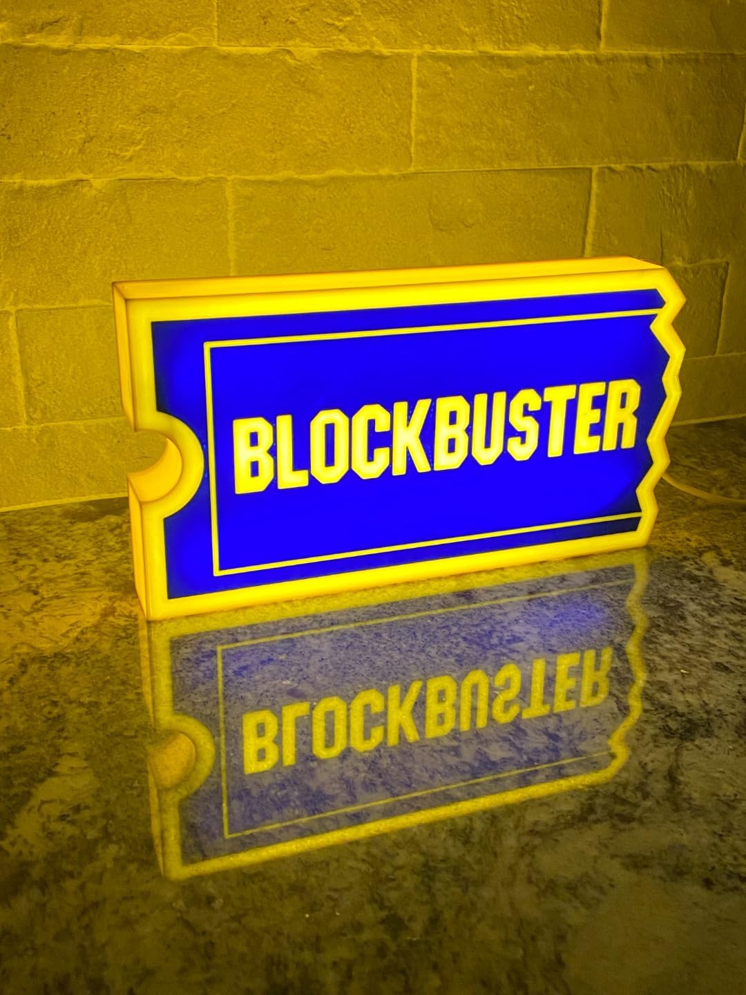 Bring the nostalgia of Friday-night rentals back to life with this Light-Up Blockbuster Video 3D Printed Sign, designed in an extra-large XL size (9” wide x 5” high) for bold, eye-catching display. Whether you're decorating a movie room, media shelf, game room, or retro-themed space, this glowing tribute to the iconic Blockbuster logo delivers instant vintage vibes. ✨ Product Highlights: 3D Printed XL Design: Crisp, clean detailing printed in high-quality PLA plastic for a sturdy, lightweight display piece. Light-Up Feature: LED lighting brings the classic Blockbuster logo to life — perfect for mood lighting or nighttime ambiance. Extra Large Size: Measures 9 inches wide x 5 inches high, making it a standout centerpiece for your setup. Retro Color Style: Faithfully inspired by the original Blockbuster blue and yellow for authentic 90s nostalgia. Relive a piece of movie-night history with this XL Light-Up Blockbuster Video Sign — a glowing reminder of the era when picking a movie was an adventure. Light is activated by a usb powered cord.