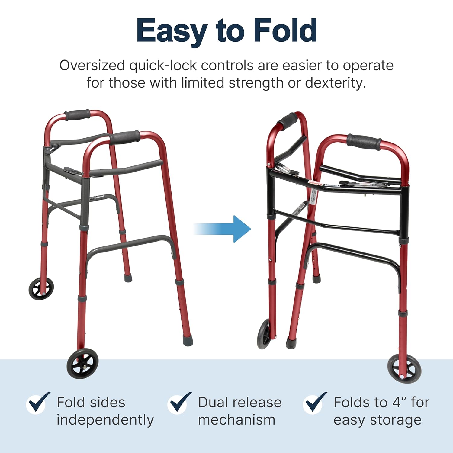 Feel confident and stylish with the Lumex ColorSelect Walker. Designed for adults and seniors, this lightweight yet sturdy walker supports up to 300 lbs and features 7 vibrant metallic colors — helping you feel more confident and less “old.” The quick-lock folding mechanism allows you to fold it flat to just 4 inches, making it easy to store and transport. Ergonomic vinyl handgrips and 5” wheels provide a smooth, comfortable feel over carpet, tile, and wood. Made from durable aluminum, this walker offers reliable strength and balance while remaining easy to lift and maneuver. With customizable options like trays, bags, and cup holders (sold seperately), the Lumex ColorSelect Walker combines functionality with personal style — helping you move with confidence every day. Dimensions & Specifications: Handgrip Width: 17" | Overall Width: 25.5" | Height: 32" - 39" | Folded Depth: 4" | Weight Capacity: 300 pounds