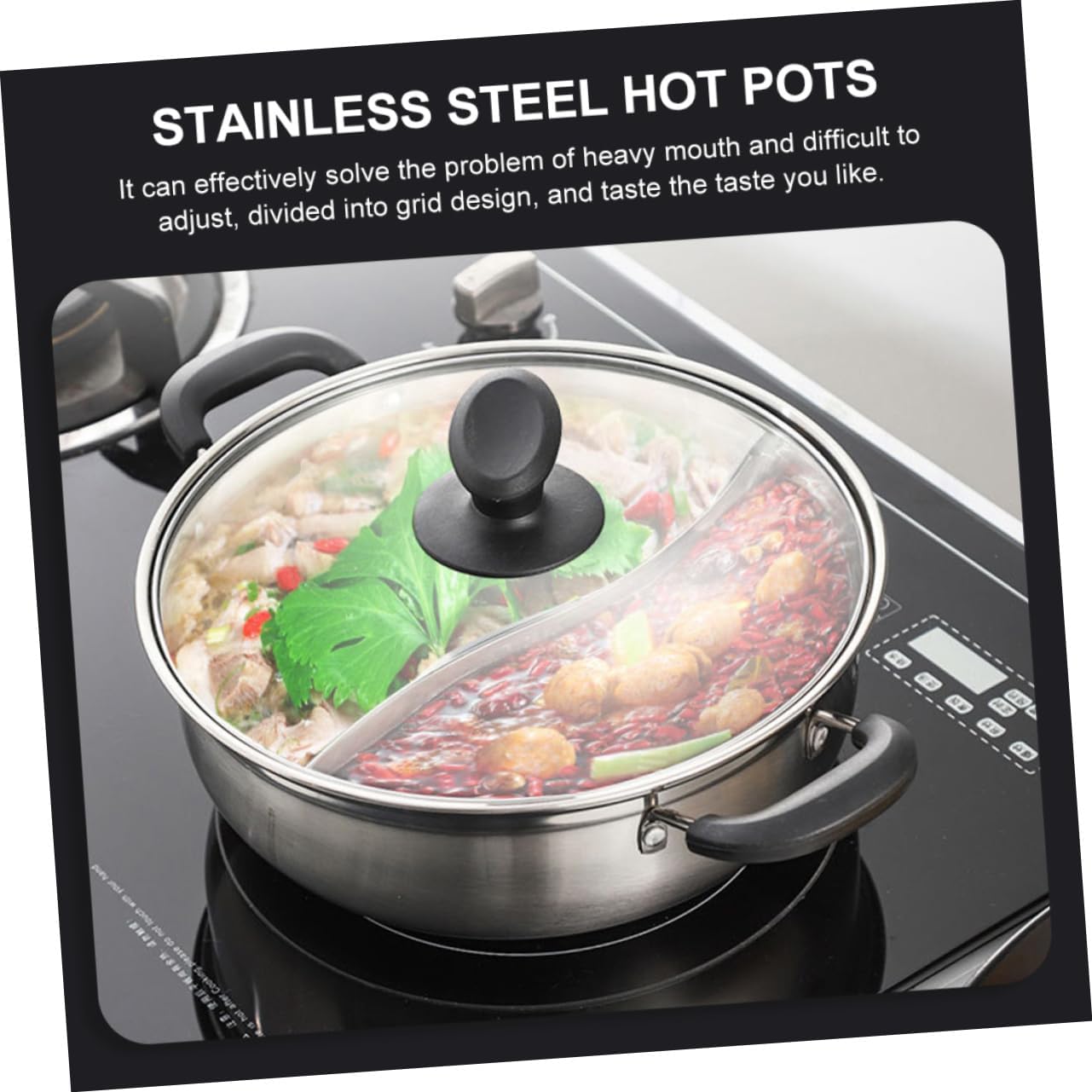 Package Include 1 x two-flavor hot pot with lid Features -Size: About 30.00X30.00X11.00cm/11.79X11.79X4.32inch Hot Pot with Lid -Material: Stainless steel, glass Hot Pot Cookware -Color:Silver Gas Cooker Pot -The pot body is made of stainless steel, strong and , Stainless Steel Hot Pots. -It is suitable for various stoves such as induction cooker, gas stove and electric ceramic stove Hot Pot Holder. -The anti-scalding handle is convenient to hold and prevents burns Induction Cooker Pot. - conduction, no waste of gas and electricity, bring you more convenience Home Kitchenware. -It can solve the problem of heavy mouth and difficult to adjust, divided into grid design, and taste the taste you like Stainless Steel Hot Pot.Goods InformationCooking Pot With compartment settings, you can cook two hot pots with different flavors.Hot Pot Holder This is a hot pot basin, made of materials, and can be used for a long time.Hot Pot with Handles Sturdy, rust-proof, not easy to deform and break.Induction Cooker Pot you deserve to have