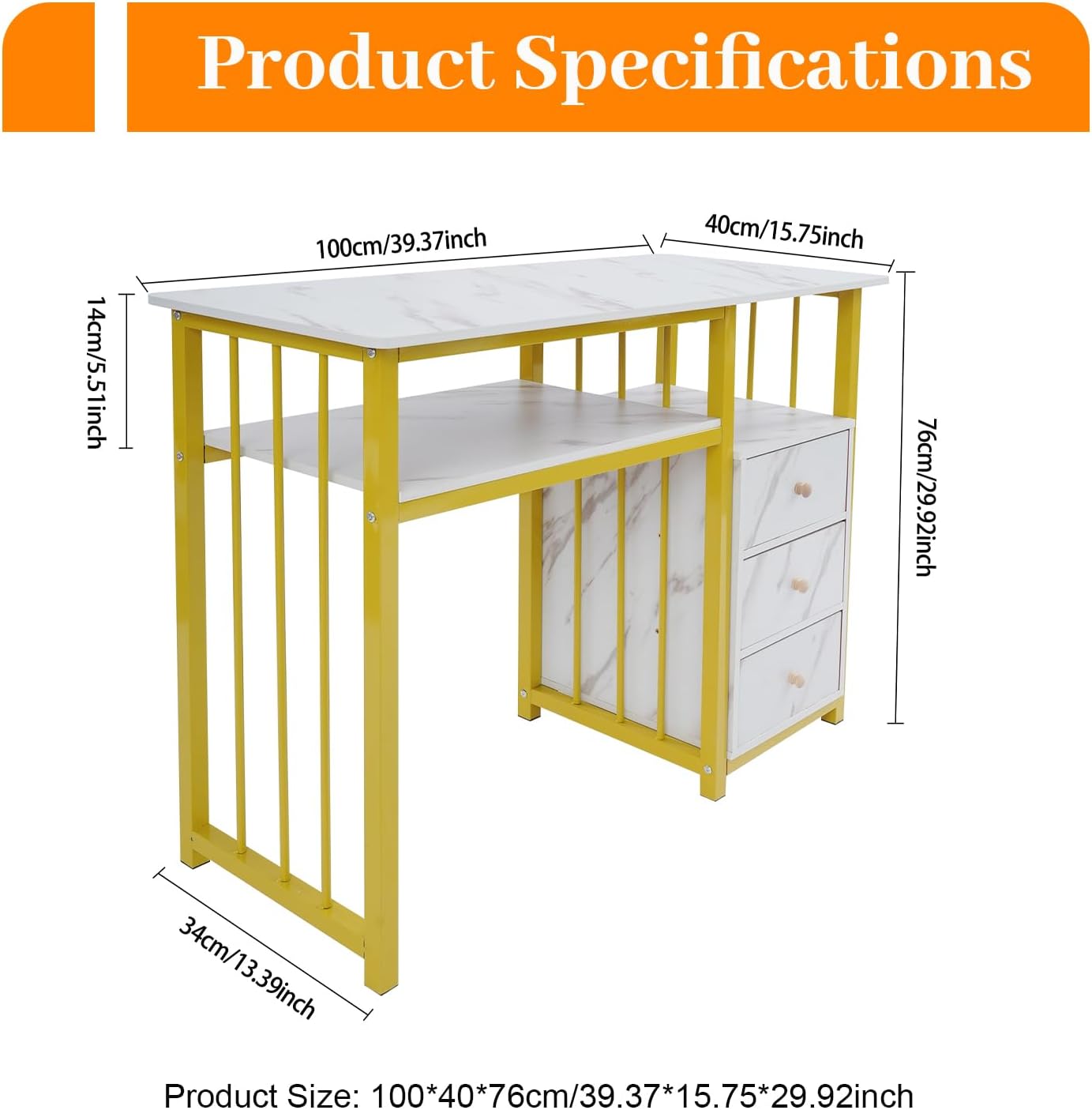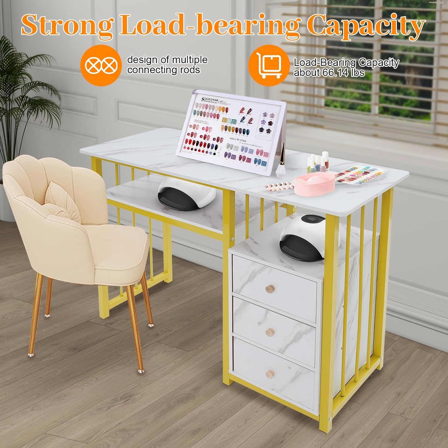 Description Thoughtfully designed for the modern nail technician, this manicure table merges ample storage and robust construction with simple assembly. Its stylish profile elevates various spaces, while the intelligent layout elevates daily workflow. Redefining compact efficiency, it brings a refined, organized, and highly functional centerpiece to your salon.Key Features【Durability & Construction】Crafted for longevity, this manicure table combines a robust steel frame with high-density board, finished with a scratch-resistant veneer. DetailsSmooth Edge: The rounded and smooth edges not only add to the aesthetics of the product but also improve the safety of use.Round Handle: It allows you to easily open and close drawers.Practical Foot Pads: The bottom foot pads provide stable support for this product while avoiding scratching the floor.Widened Desktop: The 15.75-inch wide tabletop provides enough space for you to place your items, allowing you to start a great nail experience on the spacious tabletop. ApplicationIt is suitable for living rooms, offices, nail salons, beauty salons, etc. It can be used for storing and placing nail tools, for writing and work, and even as a stylish countertop for entertaining guests.SpecificationMaterial: Density Board, Steel Frame, WoodProcess: Veneering Style: Modern Color: Gold, WhiteShape: RectangularAssembly Required: YesMounting Type: Floor MountNumber of Drawers: 3Load-Bearing Capacity: About 30kg/66.14lbsGross Weight: 18kg/39.68 lbsNet Weight: 17.1kg/37.7 lbsProduct Size: 100*40*76cm/39.37*15.75*29.92inPackage Size: 110*47*16cm/43.31*18.5*6.3inPackage Included1* Manicure Table1* English InstructionOther Accessories for AssemblyNotes1.Please use this product within the load-bearing range.2.Please note that this product does not include nail polish, nail lamps, storage boxes, or other storage items.