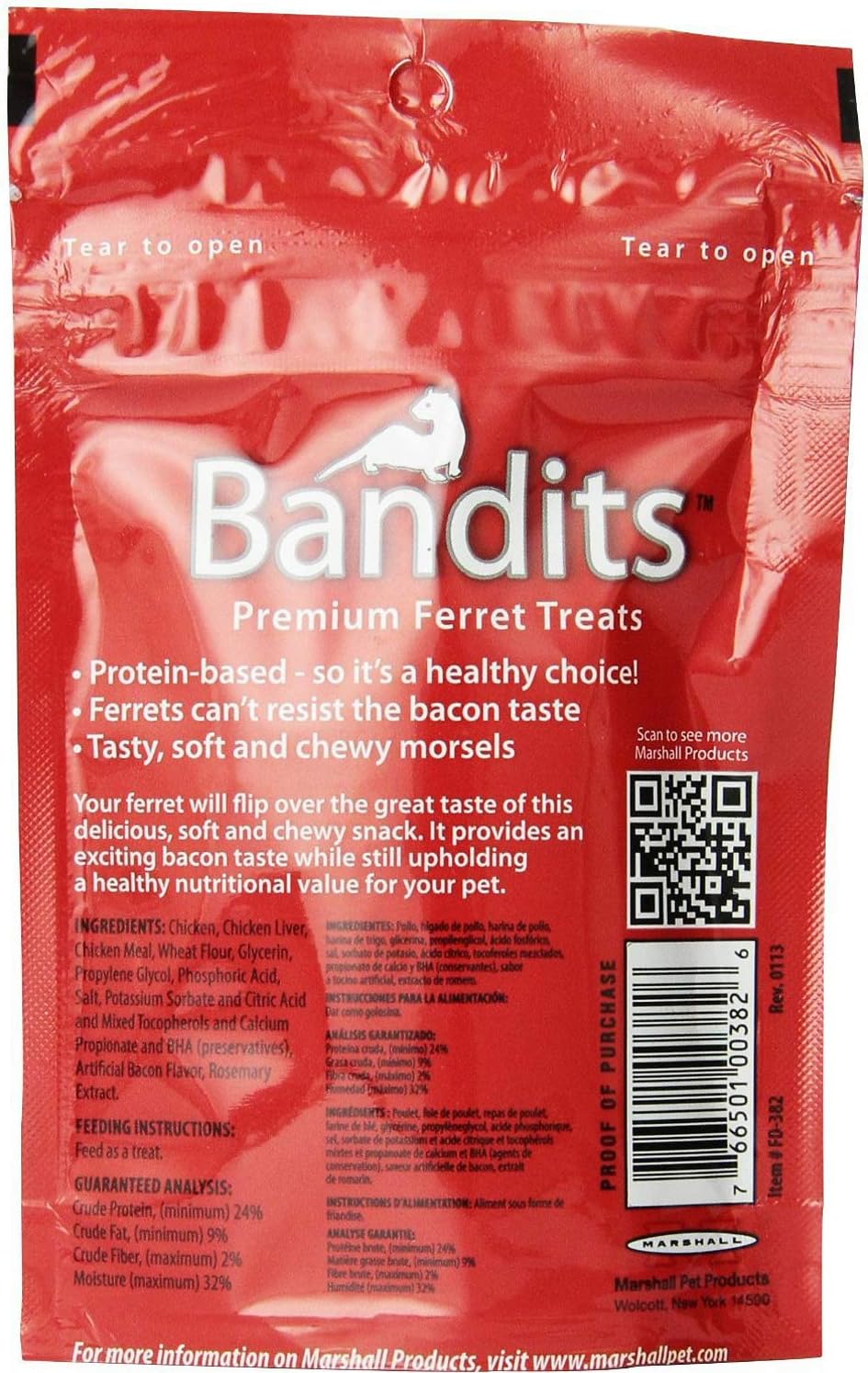 Indulge your ferret with Marshall's Bandits Premium Ferret Treats in a mouthwatering Meaty Bacon flavor. Each 3 oz pouch contains 10 individually wrapped treats, totaling 30 oz of high-protein, low-sugar goodness. Made with fresh meat ingredients, these treats are perfect for rewarding good behavior or as a healthy snack. The resealable pouch ensures freshness, and they're easy to store at room temperature.