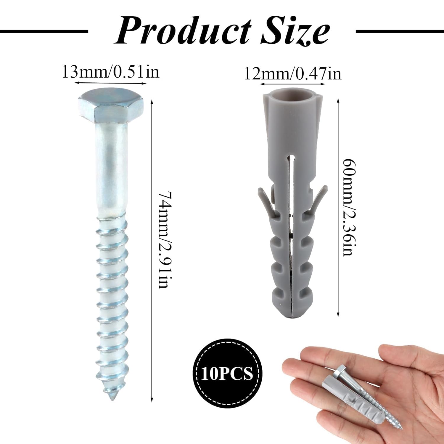 This 10-pack M8 x 80mm heavy duty wall anchor for coach screws, delivering secure and long-lasting fixings for brick, stone, and concrete walls. These anchor bolts are engineered for robust performance, making them an essential addition to any toolbox.Each concrete screw is crafted from durable galvanised steel to provide resistance to corrosion and wear in both interior and exterior conditions. The wall plugs, constructed from high-strength PE plastic, feature a four-way expansion design that maximises contact with the wall surface and ensures excellent holding strength.These wall anchors are ideal for mounting heavy fixtures like TV wall brackets, boiler units, outdoor gates, radiators, shelving units, and more. The unique design of the rawl plugs assorted in size and flexibility ensures that they won’t rotate or slip once embedded, delivering a professional-grade fix every time.Installation is straightforward—just drill a hole slightly longer than the plug, clear debris, tap the plug in, align your bracket or fitting, and secure with the coach screw using a wrench or drill. This simple method provides reliable support for concrete bolts and wall plug applications in both DIY home improvement and commercial construction scenarios.Whether you’re anchoring shelves in your garage or installing a satellite dish on an external wall, this heavy-duty masonry wall plug and coach screw set offers strength, reliability, and ease of use. With 10 complete fixings per pack, you have everything you need for a wide range of tasks