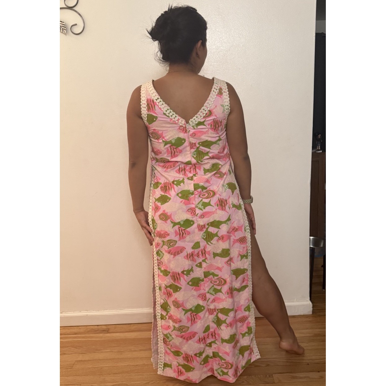 The product is a size 10 maxi dress with a colorful fish overprint, featuring a sleeveless design with open sides and a zip closure. The long dress length and regular size make it suitable for women looking for a stylish and versatile piece for various occasions. Its colorful theme and fish pattern add a fun and lively touch to the overall look.