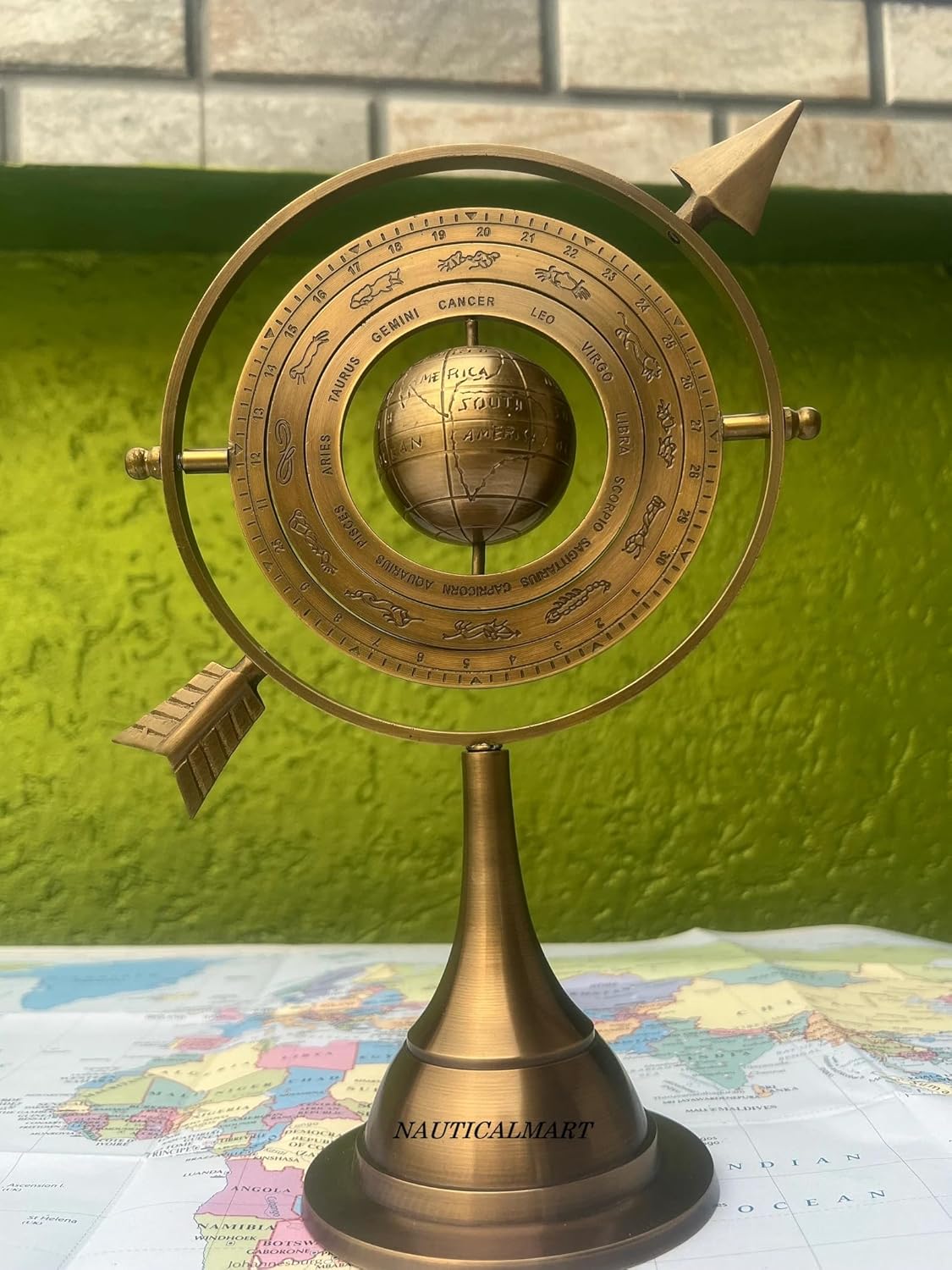 The Medieval Knight Brass Armillary Sphere – Celestial Globe Astrolabe Table Decor is a timeless decorative instrument that captures the spirit of ancient astronomy and exploration. Modeled after traditional armillary spheres, this piece showcases a system of carefully crafted rings surrounding a central globe, each representing important celestial paths such as the equator and planetary orbits. The finely detailed globe at the center features engraved geographical markings, adding both visual interest and historical authenticity. Surrounding it, the rotating rings are etched with measurement scales, echoing the tools once used by astronomers and navigators to study the heavens and determine position at sea. Accented with a distinctive directional arrow and supported by a gracefully contoured pedestal base, this armillary sphere blends function-inspired design with artistic elegance. Its antique brass finish enhances its old-world charm, making it a standout decorative piece in any environment The Medieval Knight Brass Armillary Sphere – Celestial Globe Astrolabe Table Decor is a timeless decorative instrument that captures the spirit of ancient astronomy and exploration. Modeled after traditional armillary spheres, this piece showcases a system of carefully crafted rings surrounding a central globe, each representing important celestial paths such as the equator and planetary orbits. The finely detailed globe at the center features engraved geographical markings, adding both visual interest and historical authenticity. Surrounding it, the rotating rings are etched with measurement scales, echoing the tools once used by astronomers and navigators to study the heavens and determine position at sea. Accented with a distinctive directional arrow and supported by a gracefully contoured pedestal base, this armillary sphere blends function-inspired design with artistic elegance. Its antique brass finish enhances its old-world charm, making it a standout decorative piece in any environment