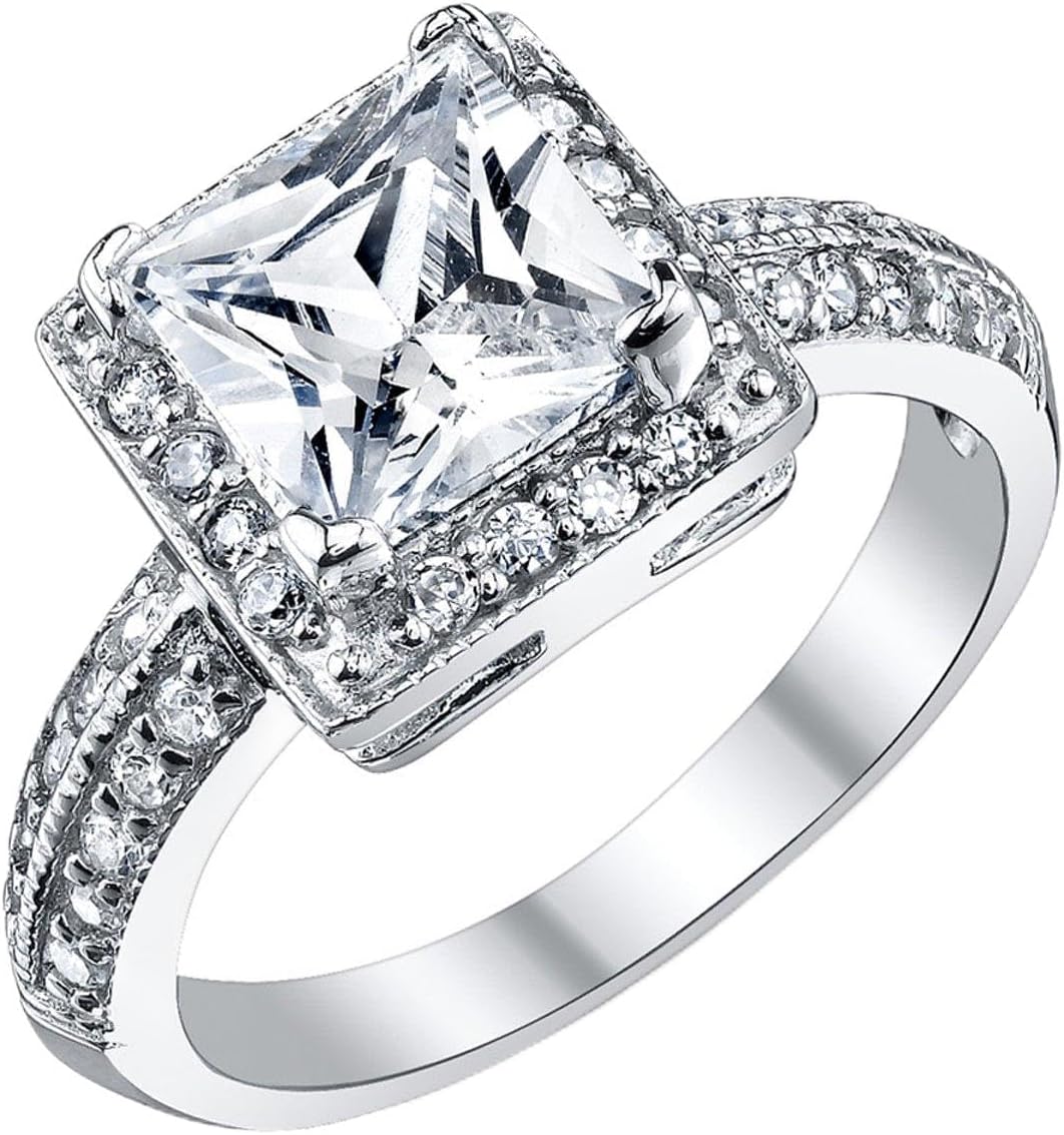 This gorgeous engagement ring from Metal Masters is sure to put a smile on her face! Glamorous and bold, this gorgeous cubic zirconia bridal-style ring set is a statement for any occasion. The rhodium plated 925 sterling silver engagement ring features a classic design with a 2 carat square princess cut center cubic zirconia stone in a four prong setting, surrounded by a halo of round stones in pavé settings. Cubic zirconia are bright white gems that mimic diamonds. The shoulders of the central ring have two lines of pavé set round CZ gems separated by a thin line of milgrain textured silver beading for added sparkle. The base of the shank has a smooth polished finish. Unique, modern and chic, this engagement ring exudes class and brilliance. Give her a gift she's sure to love with this dazzling ring.