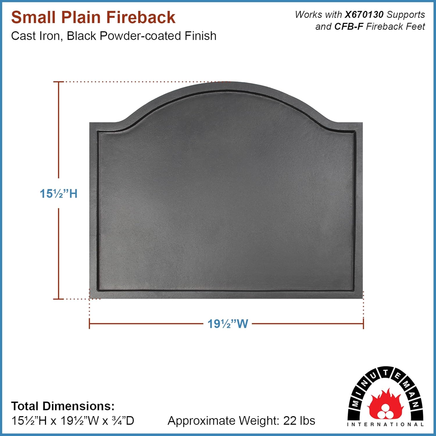 Simple and unobtrusive, these Plain Firebacks will fit into any decor, from traditional to contemporary. The fireback has been an indispensable part of the fireplace tradition in Europe since the 15th Century. The colonists carried this tradition to America and today you can add that touch of elegance and history to your own fireplace. While many people think of our Firebacks as being purely decorative, solid cast iron firebacks first absorb and then radiate the heat directly into the room, making the fireplace much more efficient at heating the house. They also protect firebrick, increasing the life of the firebox and helping to prevent further damage to an aging fireplace. Firebacks are designed to rest on the floor of the hearth, but fireback supports may also be used to hold the fireback upright and raise it off the hearth if extra height is desired. All our firebacks are designed for use with both gas logs and wood burning fireplaces, even becoming popular as a decorative element behind the kitchen stove. Minuteman International has been serving fireplace and wood-heating needs for 40 years, with a full line of decorative and functional accessories, from tool sets and screens, to wood stove steamers and hearth gloves.
