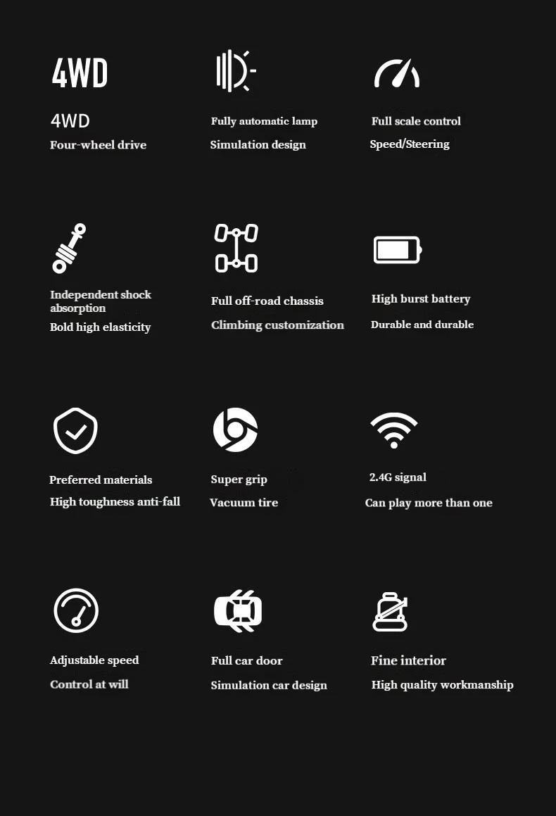 Functions: forward, backward, left turn, right turn, proportional remote control, two-stage speed change, with drag brake function, remote control to control lights
