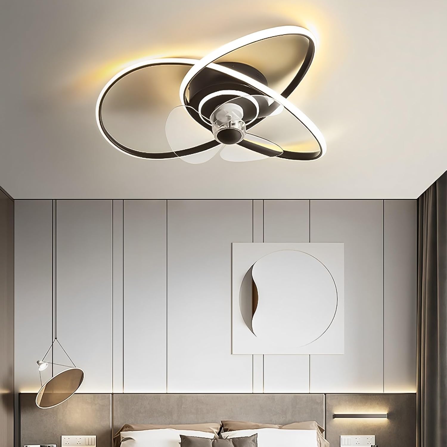 The Semi Flush Mount Ceiling Fan with Lights meets your living lighting, and it also satisfies your coolness, and has three wind speeds and three lighting modes to create a different family atmosphere. The parameters are as follows: Brand: IBalodyStyle: ModernColor: Dark,White,Gold (reference image)Shape: Round (Reference image)Material: Metal shell,ABS fan blade,Acrylic lampshadeSize: SquareLength: 56CM / 22"Width: 52CM / 20"Height: 16CM / 6.3"Power: LED light 100W Wind speed: 6 gear Fan blade: 3 piecesUse space: 10-18㎡Whether the wind speed is adjustable: yes (using the remote control, low / medium / high set around the third wind speed)Remote control: Including remote control Remote control distance:> 30mr Dimmable: Yes (adjust the color temperature and brightness of the light with the remote control)Light color: White light ( 6000 K ), Neutral light ( 4000 K ), Warm light ( 3000 K )Light source type: LED The package includes: 1 x Ceiling fan light 1 x Accessories package 1 x Remote control Scene: Remote ceiling fan with light for bedroom, living room, dinning room,kitchen, bunk bed, loft low ceiling rooms.Tips: The fan is easy to remove and, clean, when you do the cleaning, cut off the power, please.If you have any question ,please kindly contact us firstly,we are always here service for you.