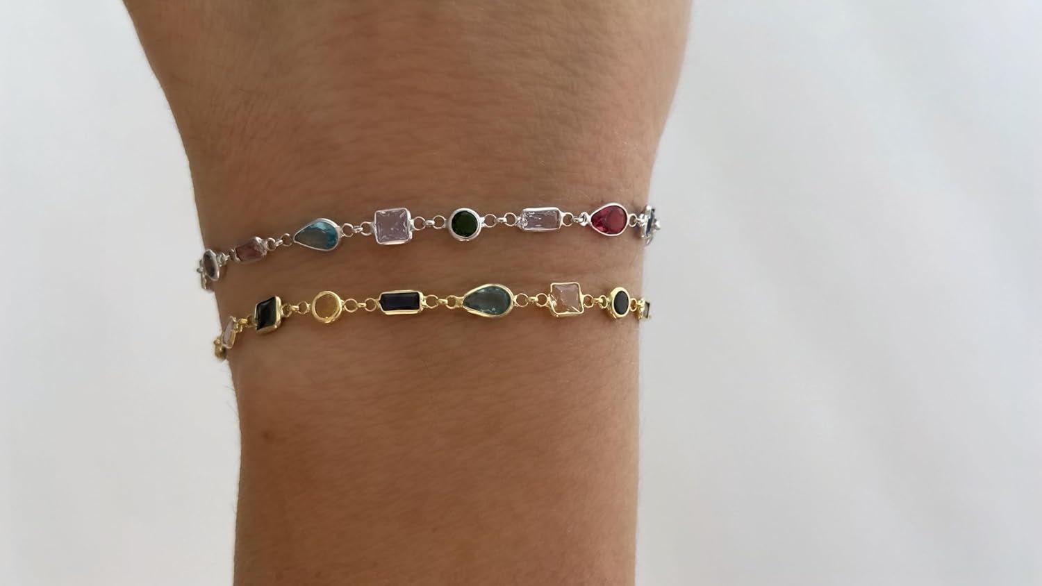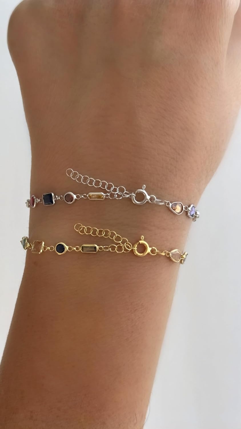 Introducing Our Dazzling Colorful Diamond Bracelet for Women: A Splash of Multicolor Elegance! Elevate your jewelry collection with our Dainty Zirconia Gemstone Chain bracelets, adorned with vibrant Crystal CZ stones set in 14K gold plating. This exquisite piece boasts a 4.5mm chain, delicately designed to accentuate your neckline with its dainty and trendy appeal. Whether you're dressing up for a special occasion or adding a pop of color to your everyday ensemble, our Crystal Diamonds bracelet is the perfect accessory to showcase your unique style. Key Features: 🌈 Colorful Cubic Zirconia Crystals: Diamond bracelet Women's features a stunning array of colorful CZ multi stones, meticulously chosen to create a captivating rainbow effect. Each stone is expertly cut and polished to perfection, exuding brilliance and sparkle that will turn heads wherever you go. ✨ 14K Gold Plated: Crafted with precision and care, our bracelet is plated with luxurious 14K gold for a radiant finish that exudes sophistication. The gold plating not only enhances the beauty of the necklace but also ensures durability and long-lasting shine. 💎 Dainty and Trendy Design: With its 4.5mm chain and dainty silhouette, our women's rainbow crystal stacking bracelet offers a modern twist on classic elegance. The trendy design makes it the perfect accessory for fashion-forward women of all ages, while the delicate construction adds a touch of femininity to any outfit. 🎁 Searching for the perfect gift for the special woman in your life? Look no further! Our Dainty Colored Diamond Gemstones bracelet comes beautifully packaged and ready to impress, making it an ideal gift for birthdays, holidays, graduations, or any occasion worth celebrating. 🤩 Satisfaction Guaranteed: We take pride in the quality and craftsmanship of our jewelry. If for any reason you're not completely satisfied with your purchase, simply let us know, and we'll make it right. Your satisfaction is our top priority. Add a splash of color gems and elegance to your jewelry collection with our multicolor Diamond Bracelet Gold.