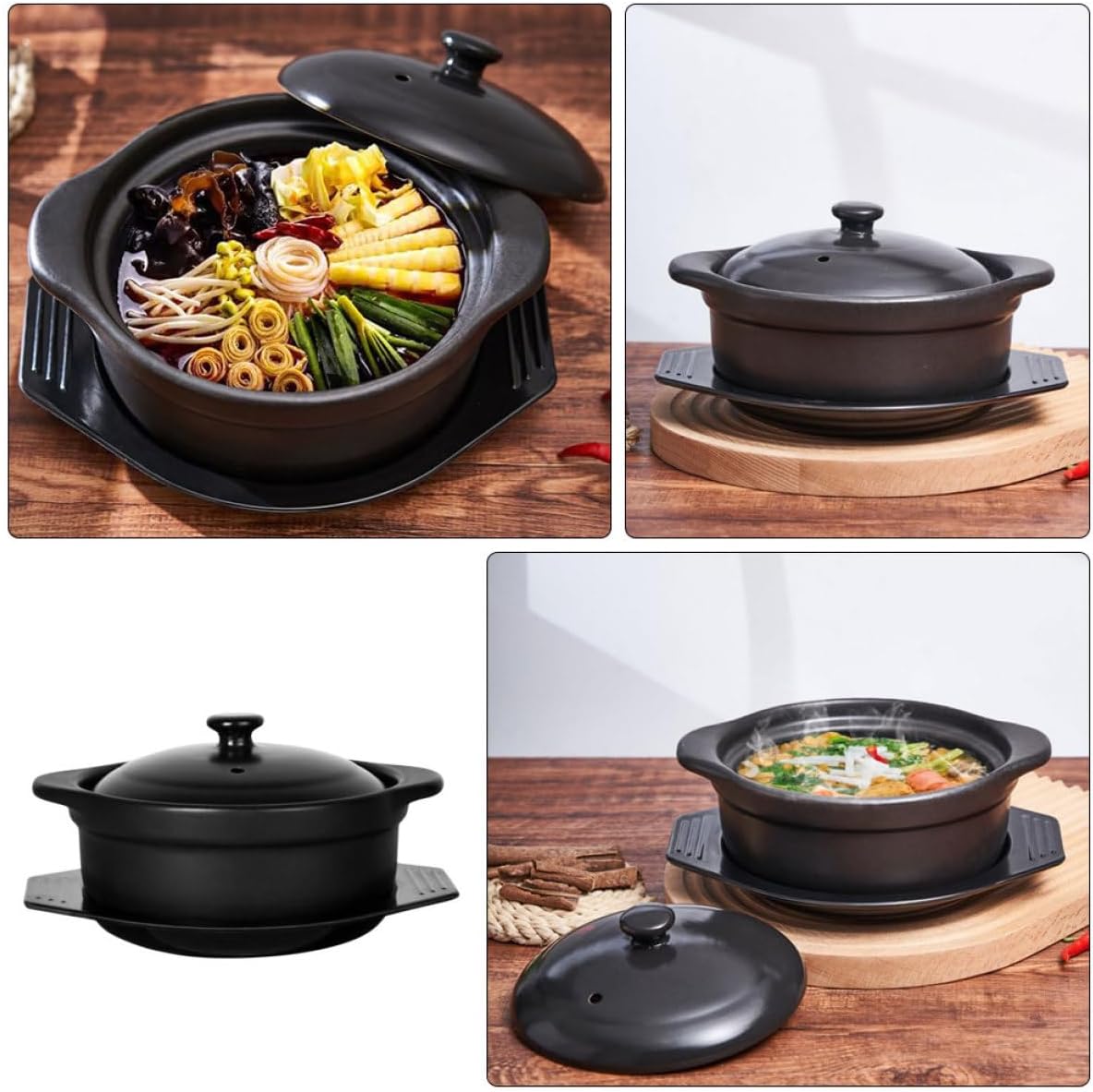 Package Include 1 x Ceramic Cooking Pot with Lid and Tray Features -Material:Ceramic -Product Info:Ceramic casserole -Size:24.00X18.00X8.00cm/9.43X7.07X3.14in -Color:Black -Capacity: 1.09L cooking pot with lid - Can be used for cooking braised chicken, rice noodles, spicy hot pot, soup rice, etc home ceramic casserole. - A great helper in your kitchen. It is time to cook a wonderful meal for your family with it stock pot with lid. - Nonstick and smooth surface makes it easy to clean and save time. Heat resistant and , it is not easy to crack and crack during cooking casserole cooking pot. - workmanship and ceramic materials a and perfect details. - Humanized and considerate binaural design, the product is very convenient to hold. Smooth surface, easy to clean, heat evenly inside the pot, insulation effect is good household casserole.Goods Informationkitchen cooking pot It is designed for cooking foods like soup, oatmeal etc.home ceramic casserole The cooking pot is manufactured of ceramic material.stock pots with lids Flat base is good for cooking quickly, convenient and easy to use.cooking pot with lid Smooth surface with simple design, suitable for home and restaurant using