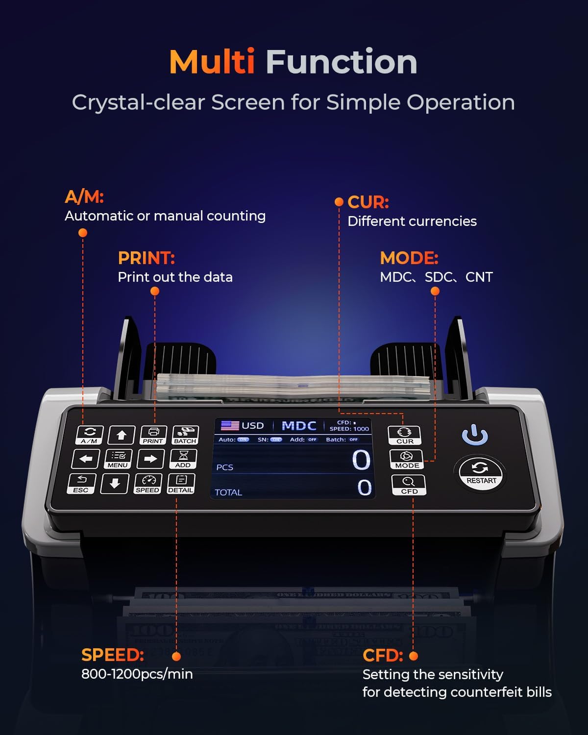 • Business Guard: The mixed denomination currency counter has 11 counterfeit detection methods to ensure your bills’ authenticity. Cash counter mixed denomination saves your effort and keeps you peace of mind when you deal with heavy cash counting work. 2CIS, UV, MG, IR, MT, and SN Recognition, effective against Superdollar.[Privacy Protection] For your privacy and security, there is no information about the cash counting machine on the outer box, ensuring the safety of your cash business
