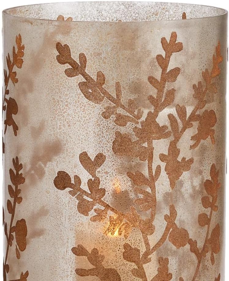 A flowing vine motif with an antiqued brown print twists and turns around speckled, smoky glass. This simple hurricane sits atop a gray turned wood base. A beautiful accent for home or office.