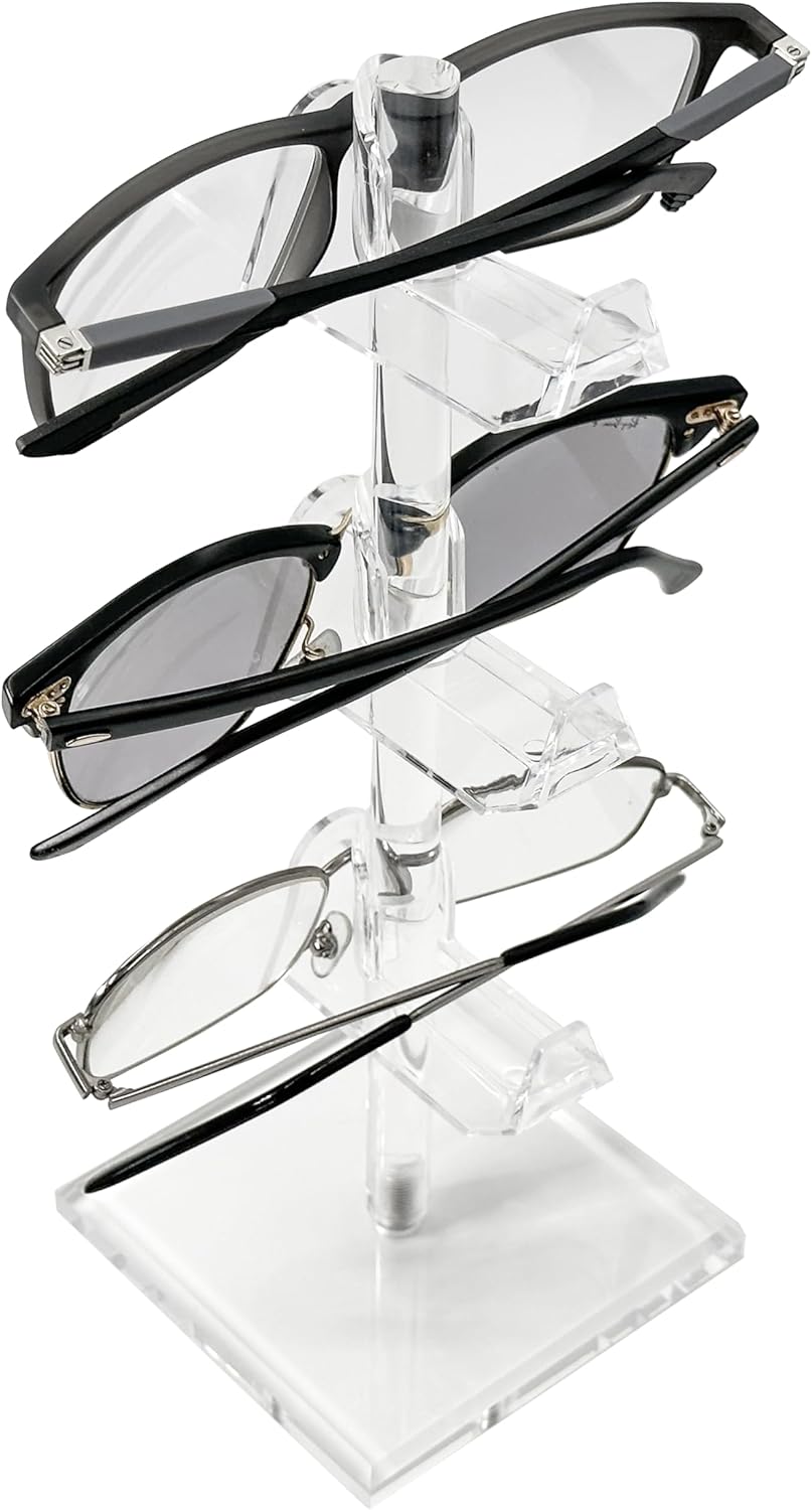 Showcase or organize your eyewear in style with this 2-pack of clear acrylic display stands, available in three tiered configurations. Designed with a modern and minimalist aesthetic, these sturdy acrylic holders offer an attractive and space-saving solution for sunglasses, prescription glasses, and reading frames. Each stand features a 3" x 3" base for a small yet stable footprint, and is available in 1-tier (4"), 2-tier (6.5"), or 3-tier (9.5") versions. Whether you’re managing your personal collection or merchandising frames in a store, this 2-pack provides flexibility and consistency in presentation. The clear arms hold eyewear securely while offering full visibility of each pair. Easy to assemble with the provided hardware, these stands are an excellent choice for home organization, retail counters, optical offices, or vendor booths.