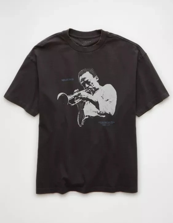 The American Eagle Boxy Miles Davis Graphic T-Shirt is a classic fit men's shirt in size 2XL, featuring a short sleeve design and a dusted slate color. The shirt is branded by American Eagle Outfitters and showcases a music theme, specifically paying homage to the iconic musician Miles Davis. Perfect for fans of music and fashion, this t-shirt is a stylish addition to any wardrobe.