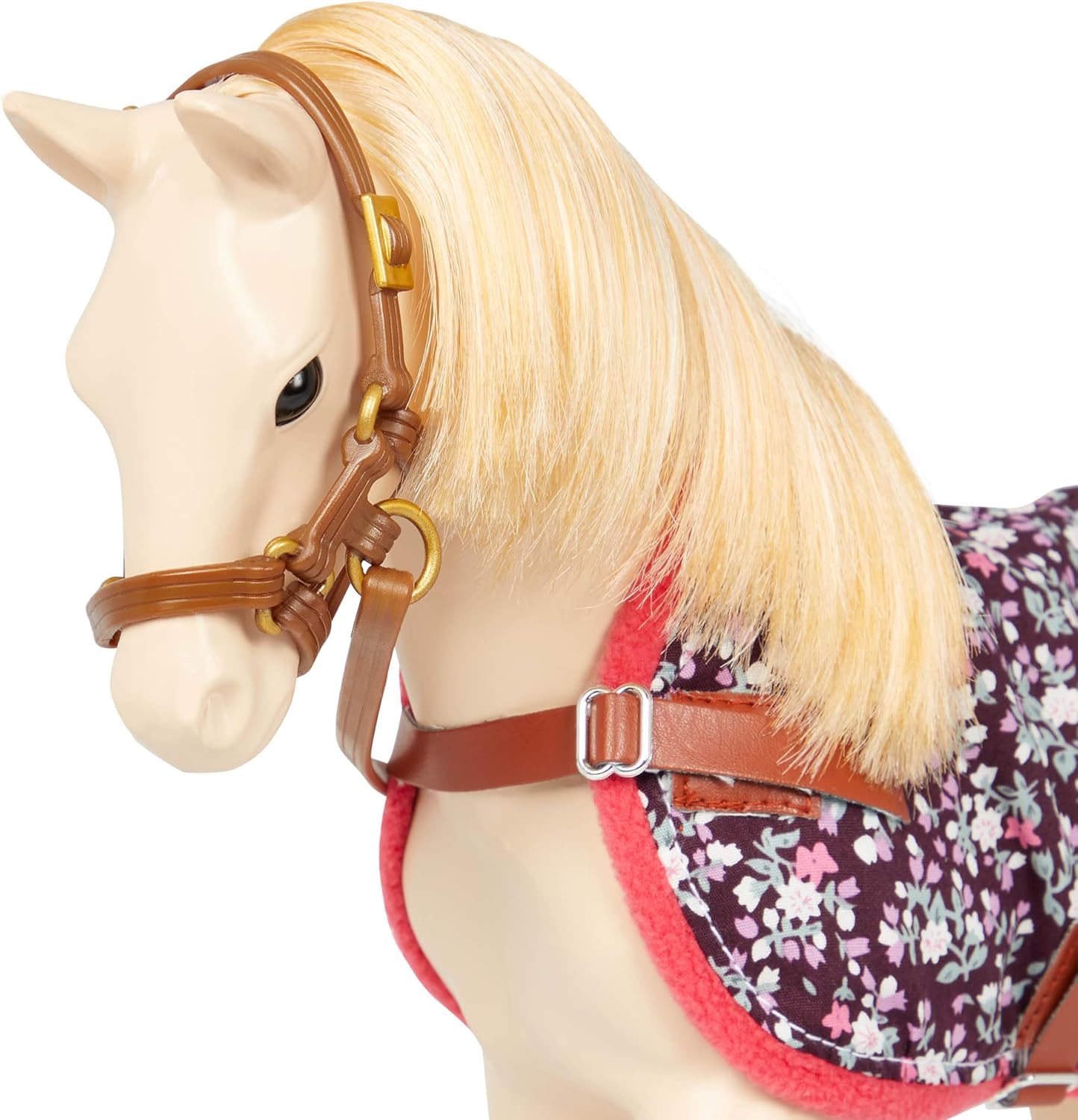 The Palomino foal has a beautiful cream-colored coat and a blonde mane and tail that you can brush and style! Dress your foal in the floral foal blanket to keep her warm, and use the matching faux-leather halter and lead to take her for a walk around the paddock. The set of grooming accessories includes a bucket, sponge, curry brush, cleaning bottles, and a grooming mitt to help you take great care of your baby horse friend.