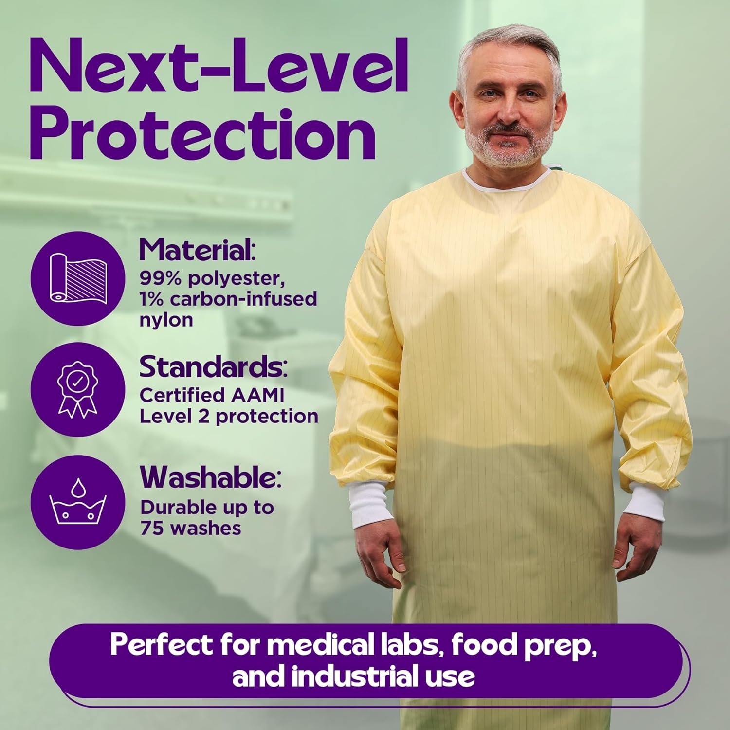 Experience lightweight yet durable protection with our high-quality protective gowns, designed from 99% polyester and 1% carbon for a blend of strength and comfort. Built to resist splashes, dust, and grime, these gowns are perfect for keeping your clothes clean and protected in any demanding work environment.Engineered for reuse, these gowns stand apart from disposable options, providing durability and cost savings. They’re washable up to 75 times, making them ideal for industries that need consistent, eco-friendly protection without the frequent waste of single-use products.Meets AAMI 2 Level standards, our gowns offer reliable protection across various settings — from labs and universities to construction sites and industrial workspaces. Elastic wrist cuffs and a universal fit ensure a secure and comfortable wear, allowing full freedom of movement. The breathable fabric keeps you cool, even during long hours, for all-day comfort.Versatile enough for multiple industries, these gowns provide comprehensive protection for professionals in fields such as hospitality, healthcare, food preparation, construction, and more. Maintain cleanliness and peace of mind while tackling your work with confidence.ADD TO CART NOW and invest in a reliable, cost-effective protective solution for your industry needs!