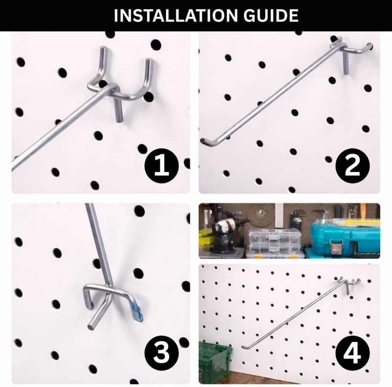 Improve your garage storage or retail display setup with our heavy-duty pegboard hooks designed for durability and versatility. Crafted from high-quality metal, these peg board shelving hooks provide strong and dependable support for tools, hardware, accessories, and retail merchandise.Designed to fit standard pegboard panels, these hooks are ideal for garages, workshops, retail stores, supermarkets, and storage rooms. Their heavy duty construction ensures stability while maintaining a clean and professional display appearance.Available in multiple sizes, including 4-inch, 6-inch, 8-inch, 10-inch, and 12-inch options, along with black, silver, and white finishes, these pegboard display hooks help you customize your organization system efficiently.Bulk pack options of 50, 100, and 200 pieces make them suitable for both commercial and residential applications.Reliable. Practical. Built for organized storage and professional retail display.